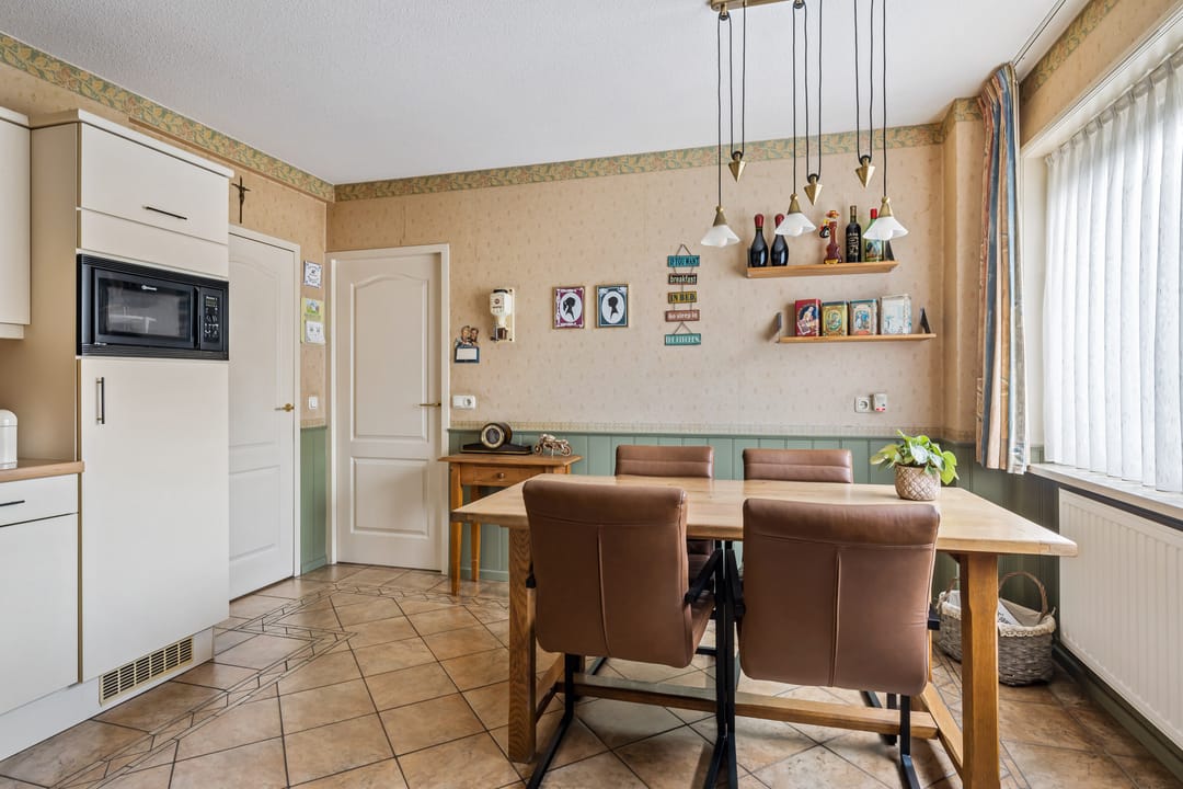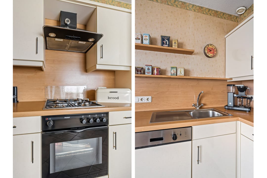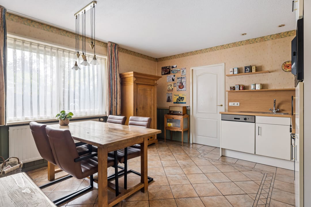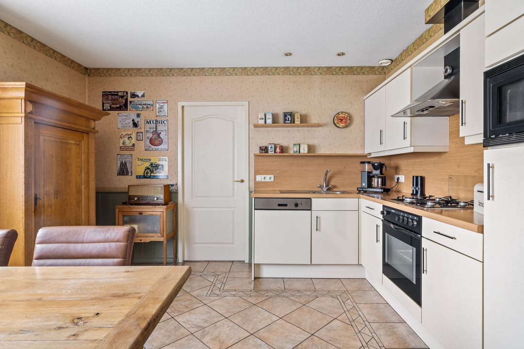 Aansluitend aan de woonkamer ligt de woonkeuken. De keukeninrichting bestaat uit een hoekopstelling uitgevoerd met een werkblad met daarin een gaskookplaat en een spoelbak. Daarnaast is er een afzuigkap, koelkast, oven, magnetron en vaatwasser. In de keuken komt ook weer dezelfde plavuis terug als in de woonkamer en de hal. Er is lambrisering en behang op de wanden aangebracht en de het plafond is gespoten. Vanuit de keuken kun je naar een kleine hal met de toiletruimte en de doorgang naar de bedrijfshal.