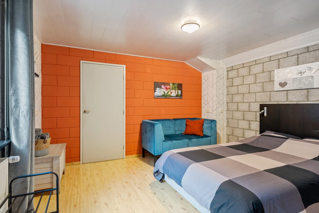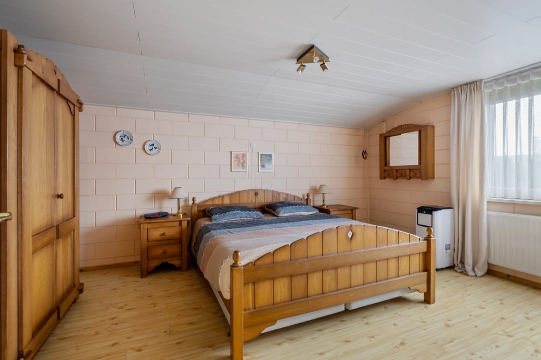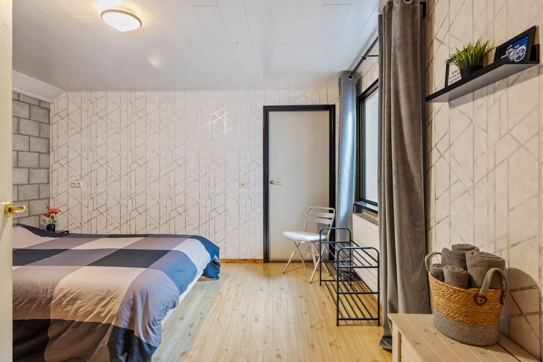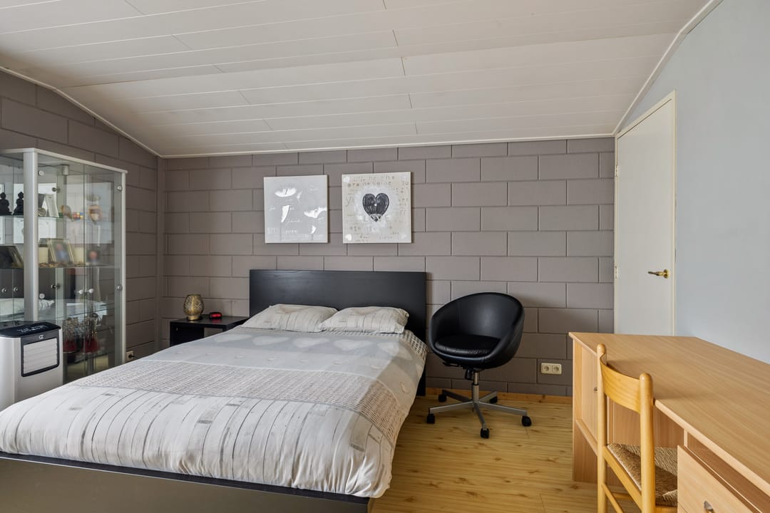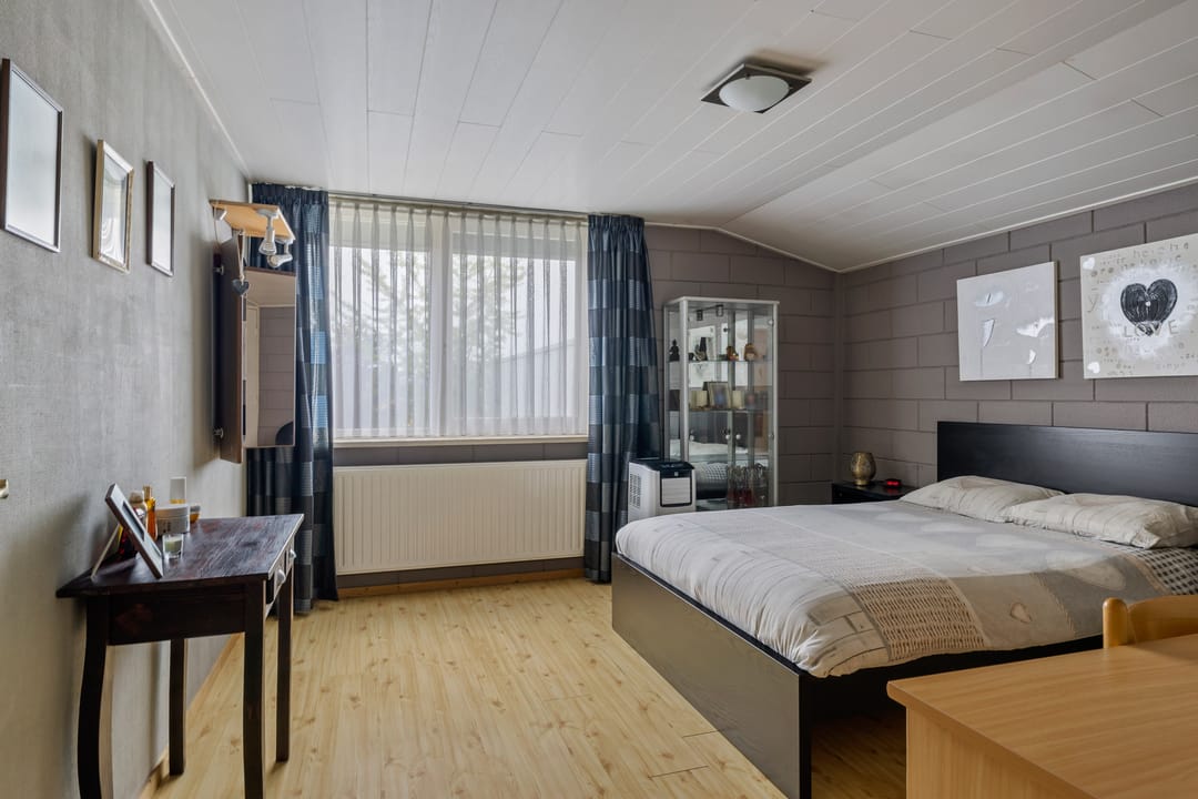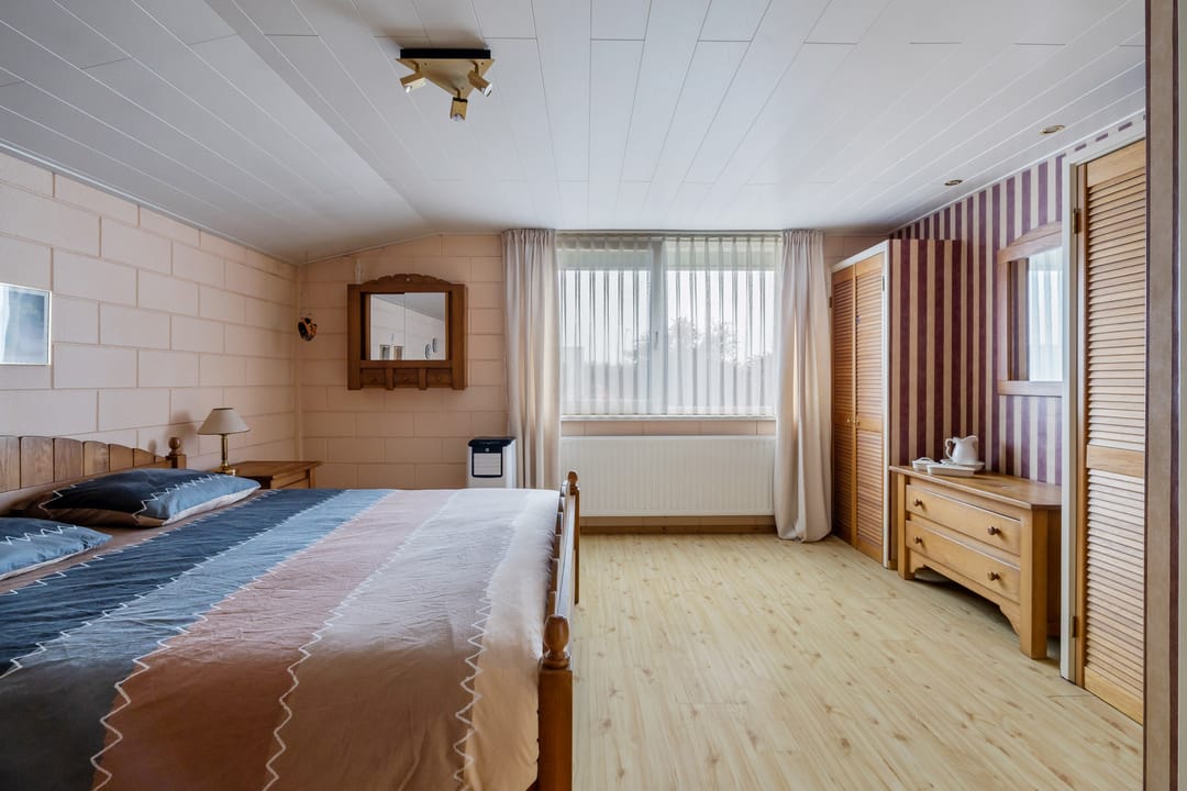 Slaapkamer 1 is met een vloeroppervlak van ca. 20 m2 lekker ruim. Op de vloer ligt laminaat, de wanden bestaan uit Ytong blokken in het zicht en behang. Het plafond is afgewerkt met mdf-panelen. Twee vaste kasten zorgen voor voldoende bergruimte.