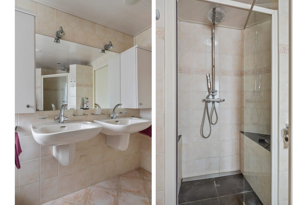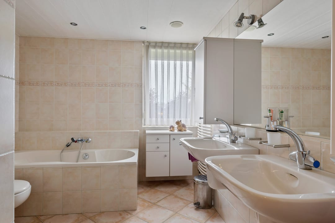 De badkamer heeft een complete uitvoering. Er is een ligbad, een douche (met hand- en regendouche), wandcloset en er zijn 2 wastafels. De badkamer is geheel betegeld waarbij de betegelde vloer is uitgevoerd met vloerverwarming.