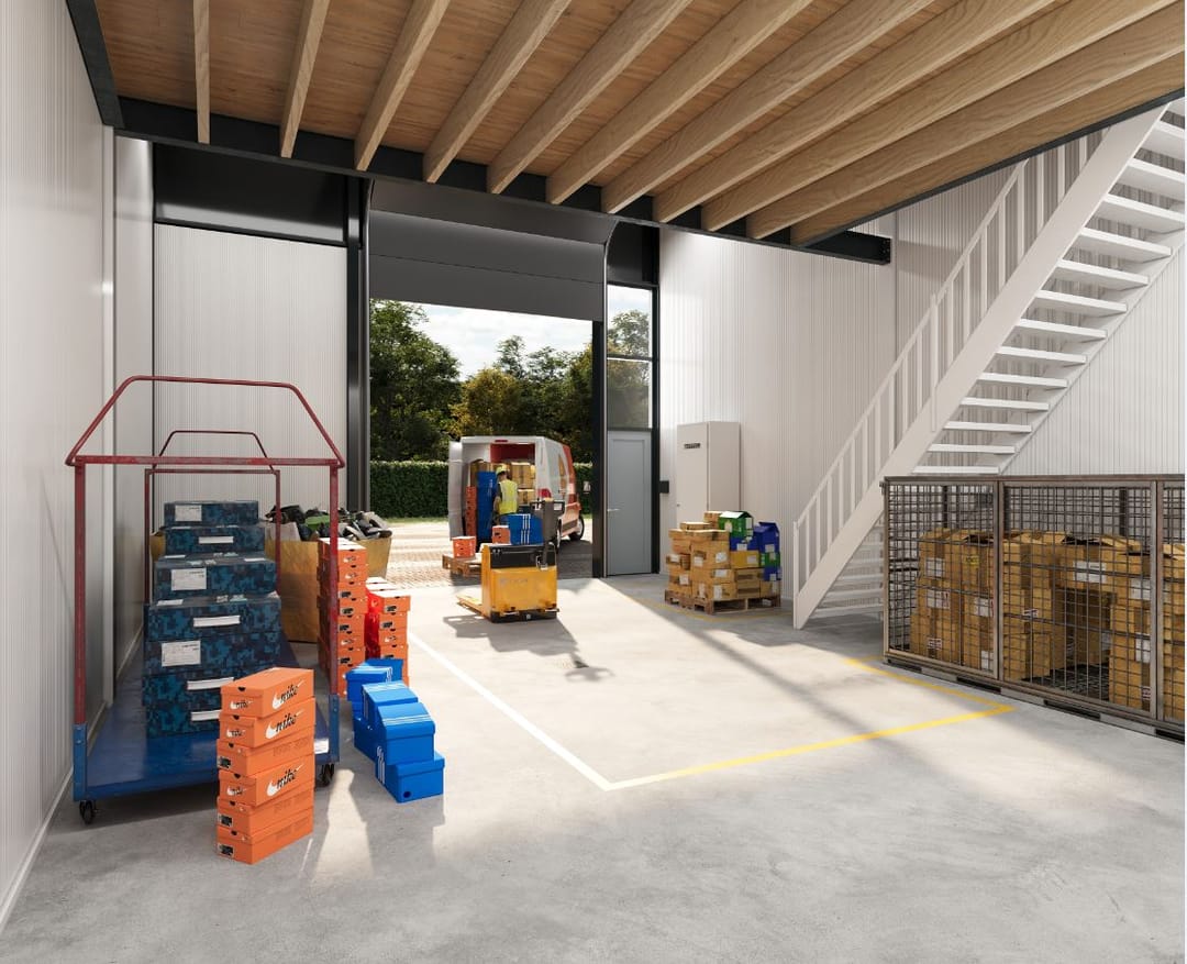 Iedere bedrijfsunit is voorzien van een eigen entree, een separate loopdeur met groot bovenlicht, een royale overheaddeur voor eenvoudig laden en lossen en een betonvloer.