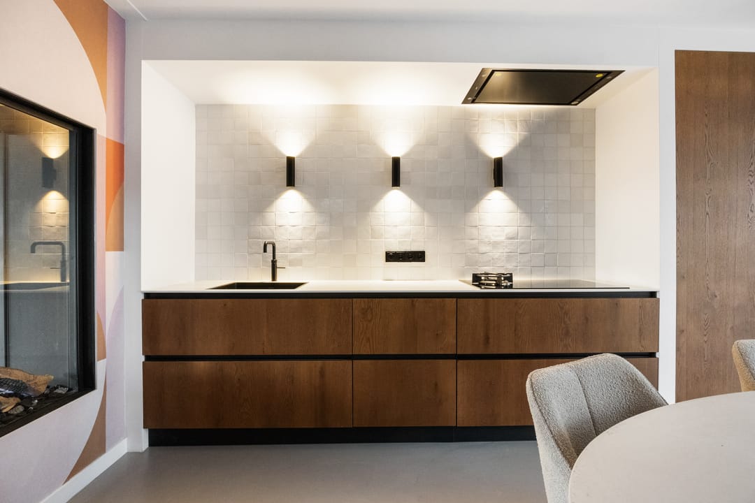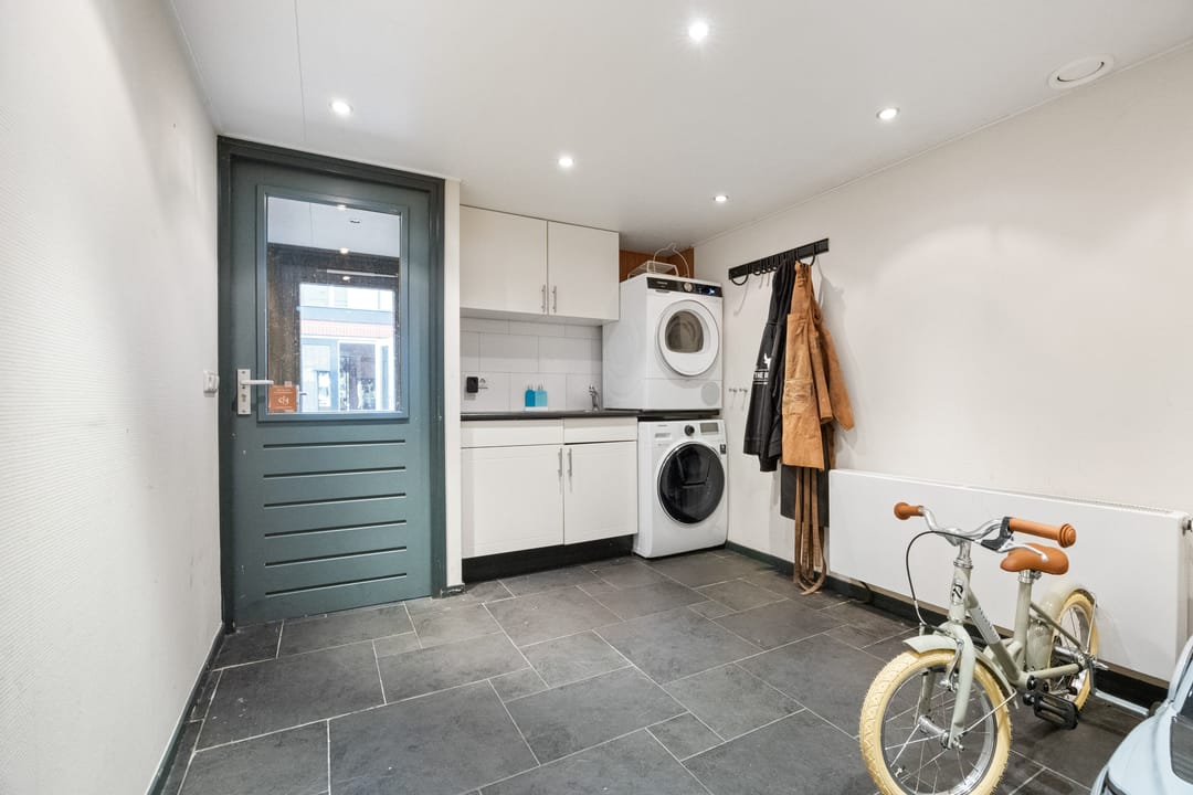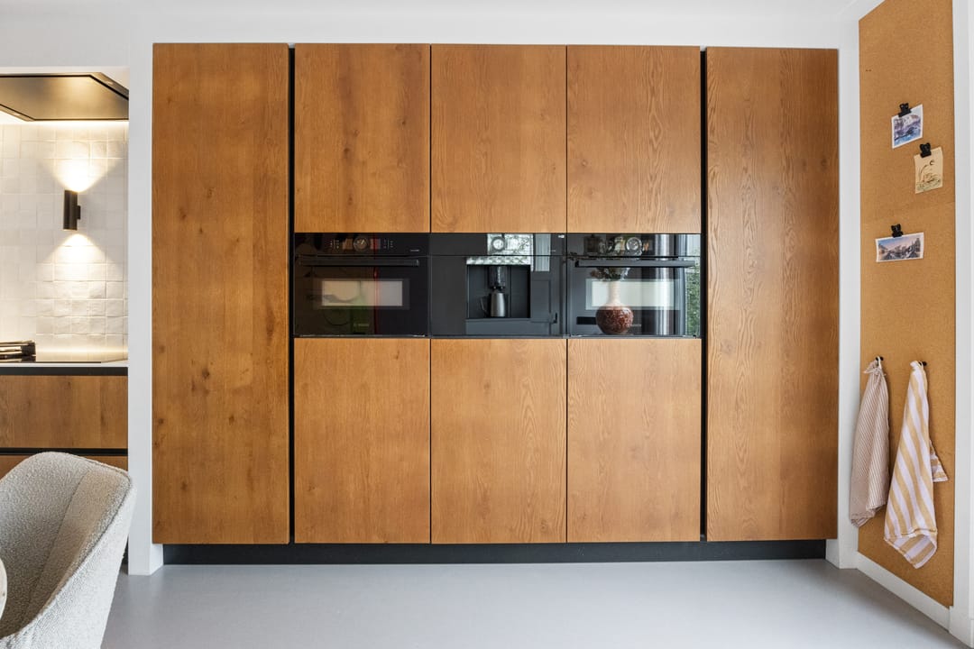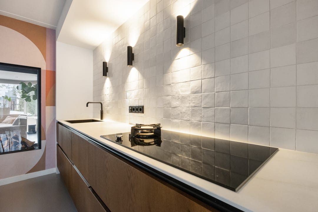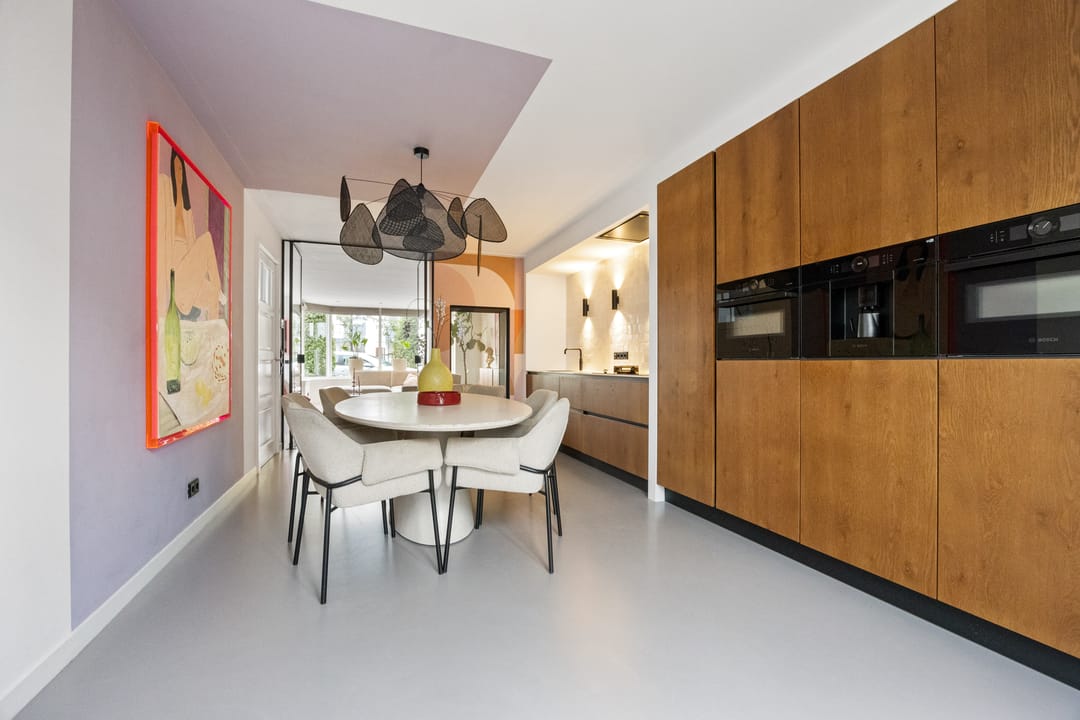 Via de openslaande stalen deuren kom je binnen in de moderne open keuken aan de achterzijde. Dit een absolute blikvanger: uitgevoerd in warme houttinten met een strak werkblad, voorzien van hoogwaardige inbouwapparatuur waaronder een oven, combimagnetron, koffiemachine, Quooker, inductiekookplaat en afzuigkap. De ruime eethoek met dubbele openslaande deuren naar de tuin maakt dit een heerlijke plek met veel daglicht.
