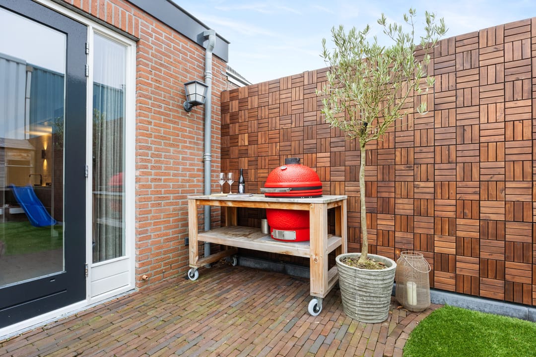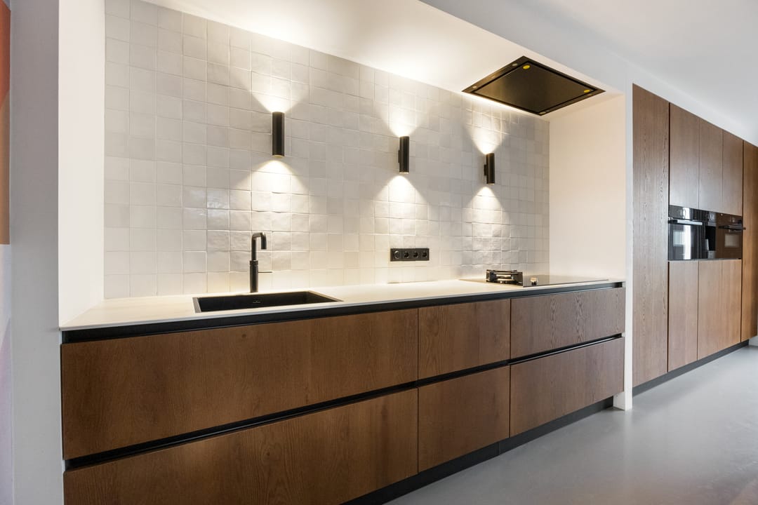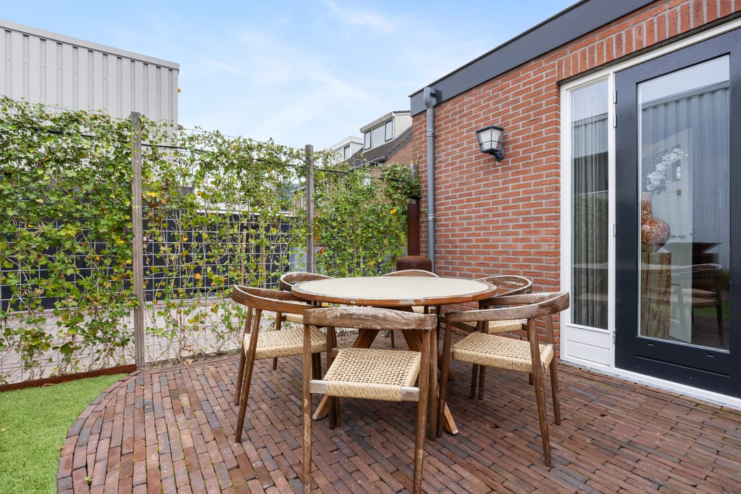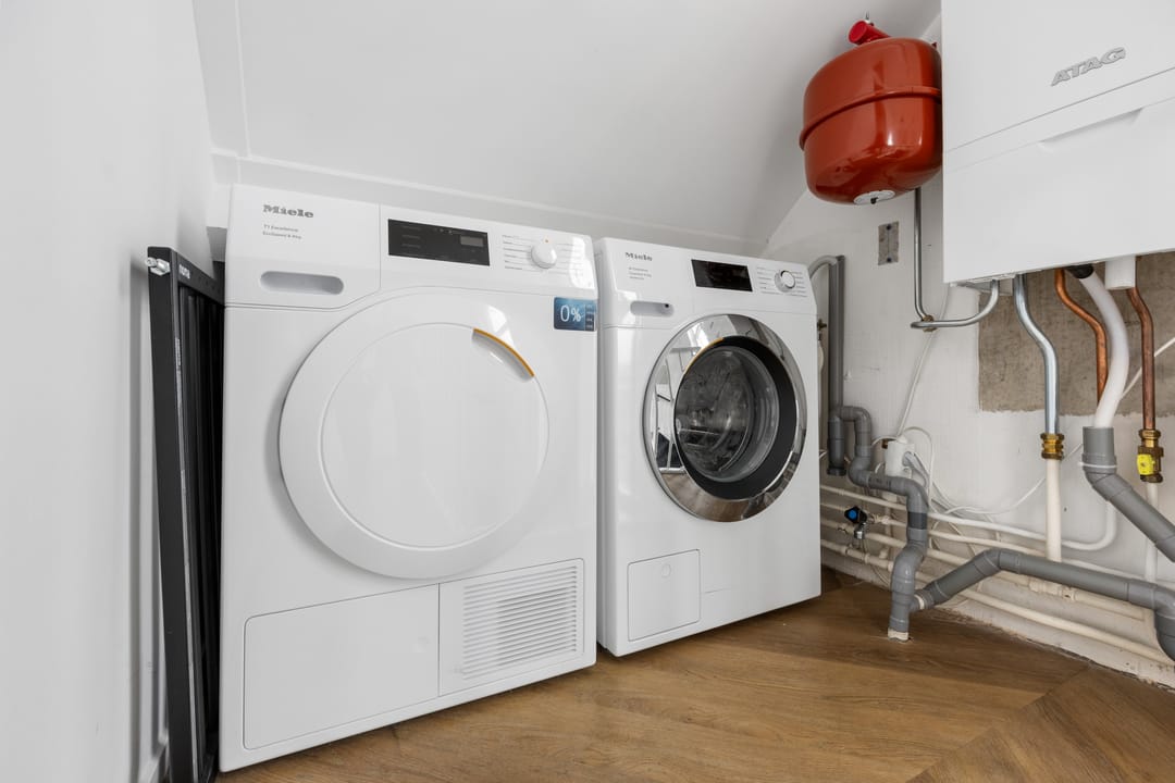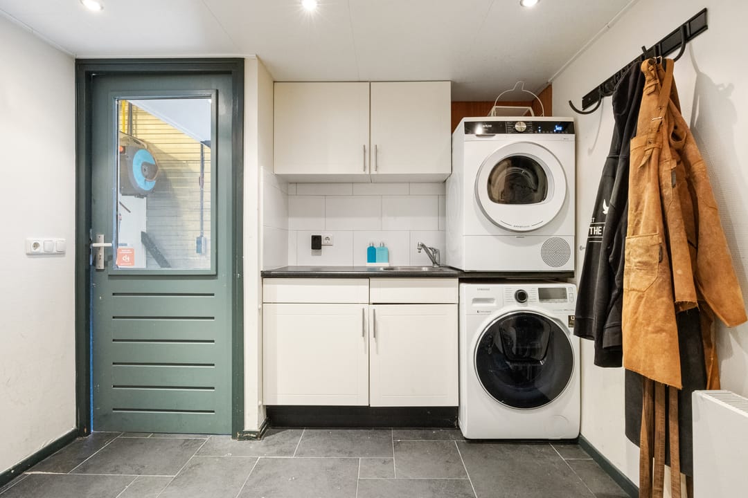 Via de openslaande stalen deuren kom je binnen in de moderne open keuken aan de achterzijde. Dit een absolute blikvanger: uitgevoerd in warme houttinten met een strak werkblad, voorzien van hoogwaardige inbouwapparatuur waaronder een oven, combimagnetron, koffiemachine, Quooker, inductiekookplaat en afzuigkap. De ruime eethoek met dubbele openslaande deuren naar de tuin maakt dit een heerlijke plek met veel daglicht.