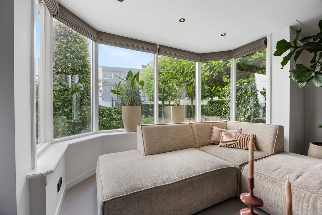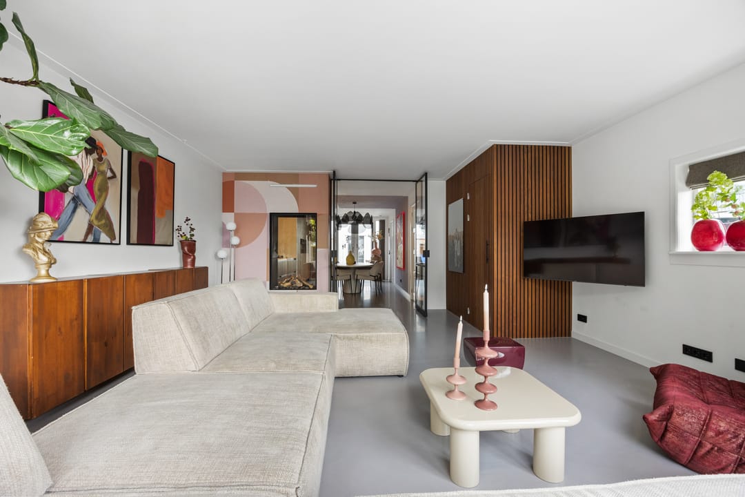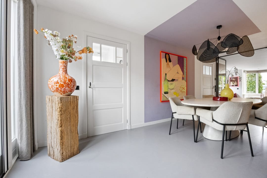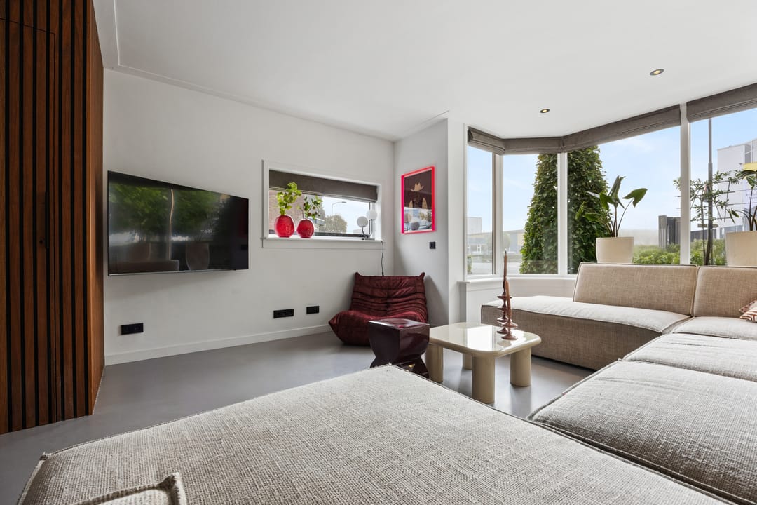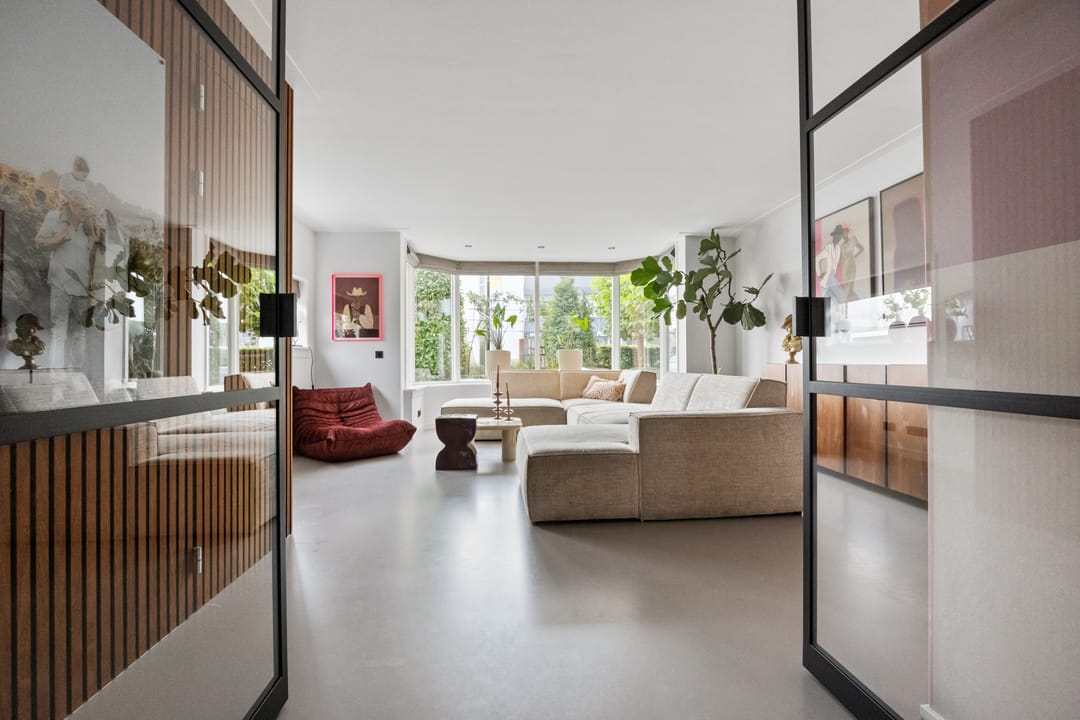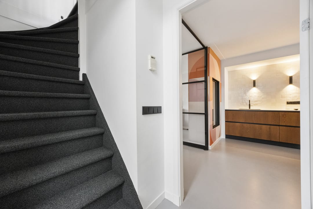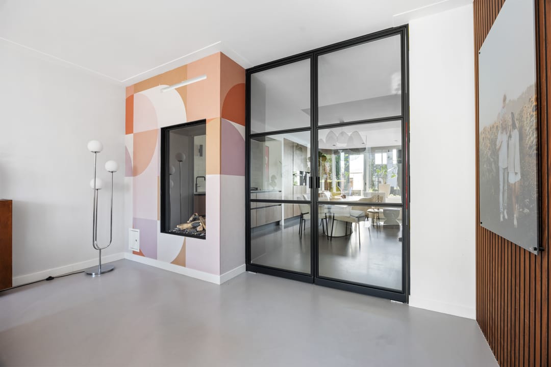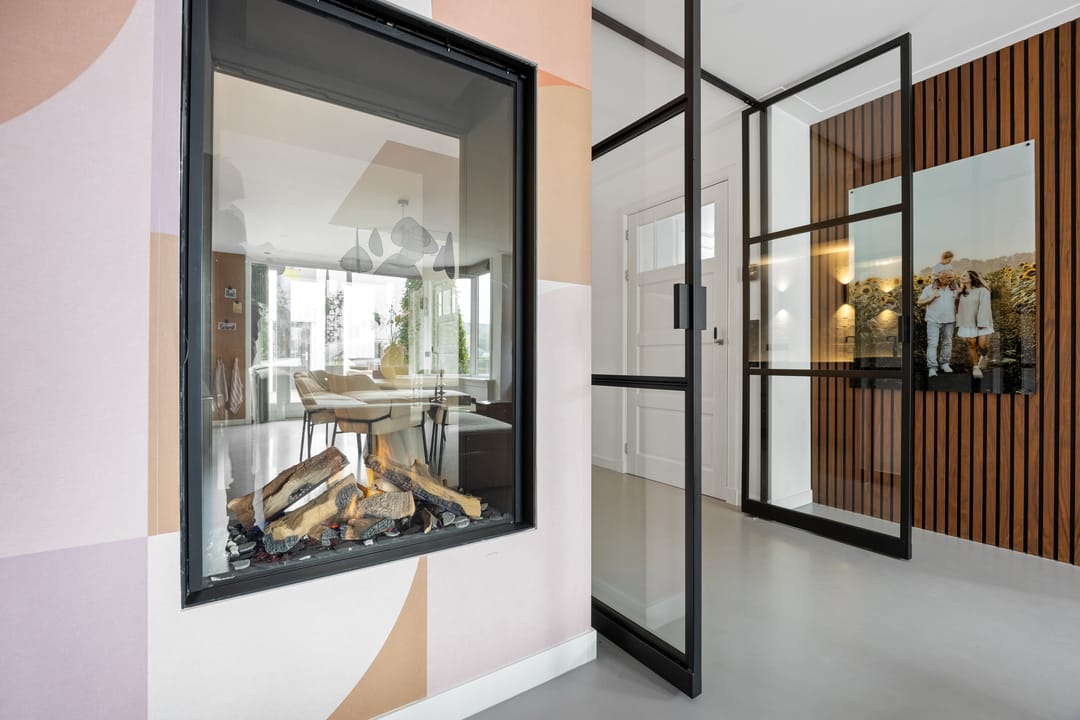De entree biedt toegang tot de meterkast en de trapopgang naar de verdieping. Hierna betreden we de keuken en aan de voorzijde de woonkamer. De ruimte is licht en sfeervol, mede dankzij de grote erker met vrij uitzicht op de voortuin en de lichte gietvloer. Centraal in de ruimte bevindt zich een stijlvolle doorkijkhaard die de woonkamer en keuken op elegante wijze met elkaar verbindt.