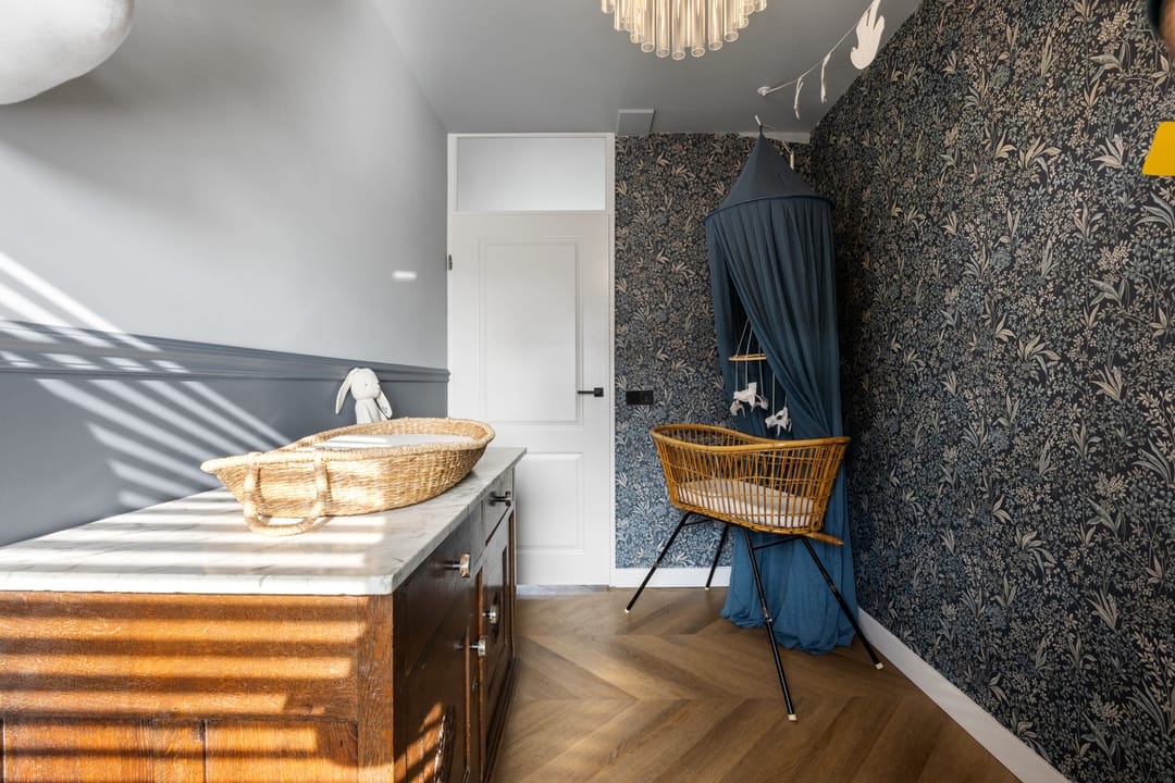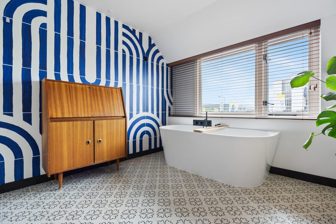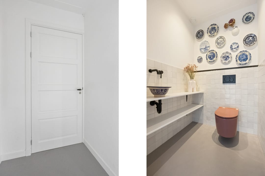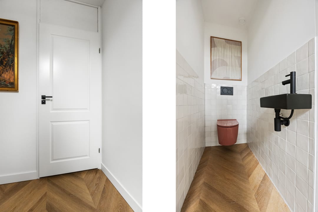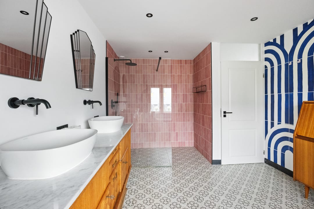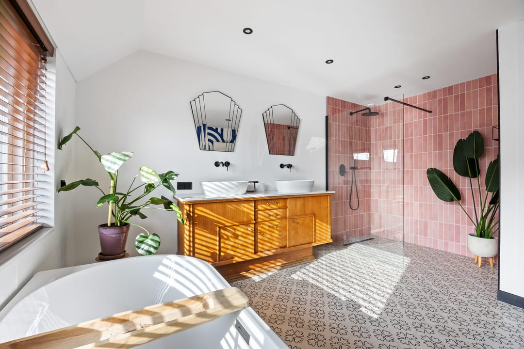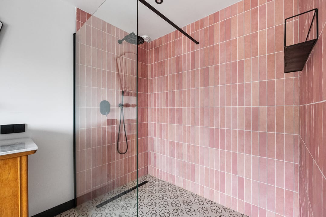De badkamer is een parel op zich: de origineel vormgegeven met roze en blauwe wandtegels, een ruime inloopdouche met regendouche, dubbel wastafelmeubel heeft een moderne uitstraling. De afwerking en materiaalkeuze zijn tot in detail doordacht. Het toilet is apart bereikbaar via de overloop.