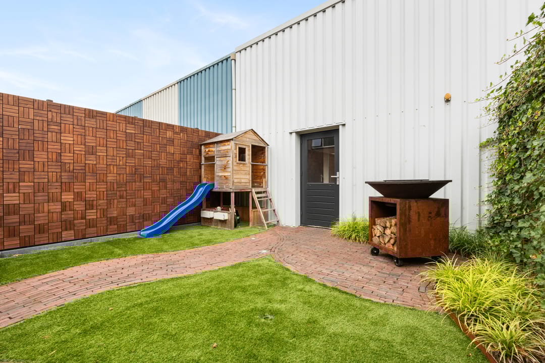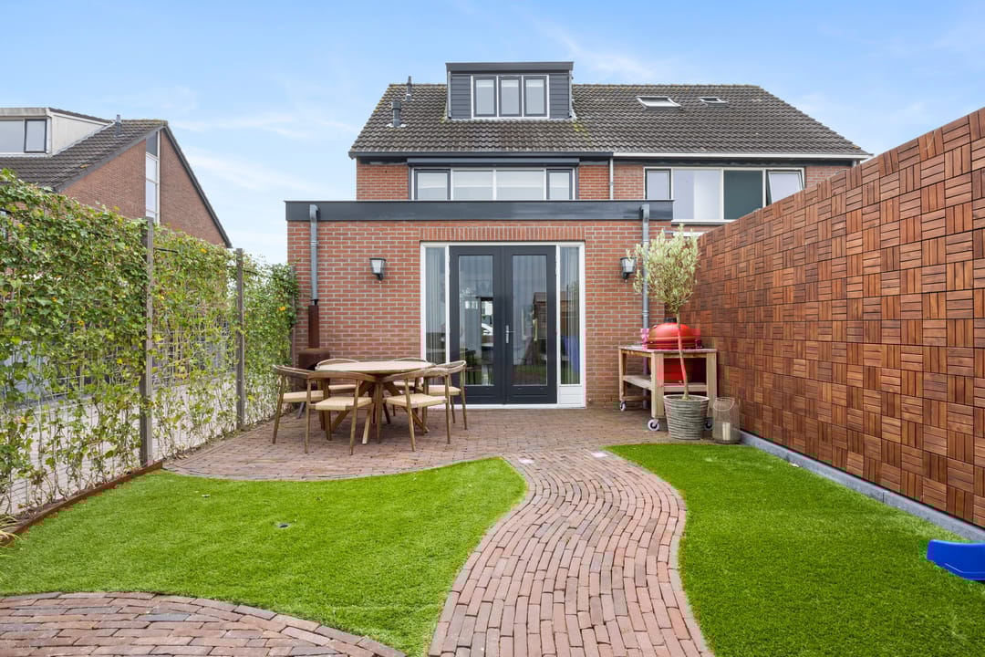 De achtertuin is verzorgd aangelegd met voldoende ruimte voor een terras en speelplek. Aan de voorzijde is eveneens een fraai aangelegde tuin aanwezig waar ruimte is voor 2 parkeerplaatsen.
