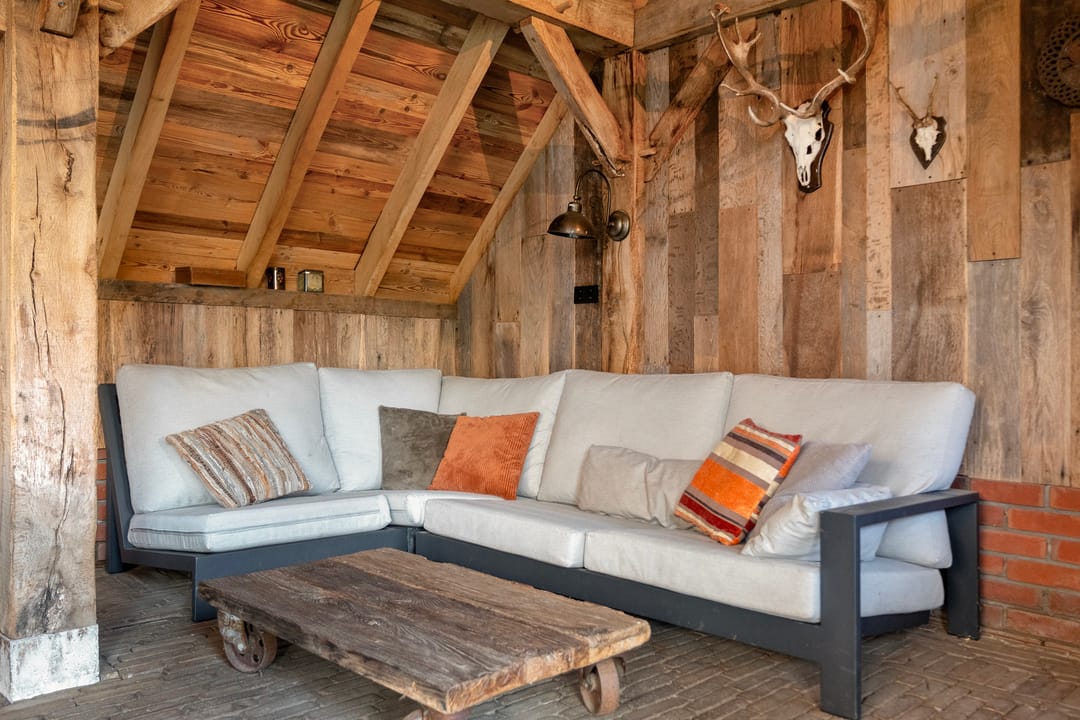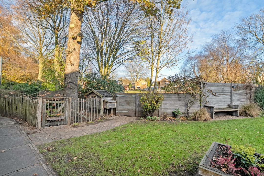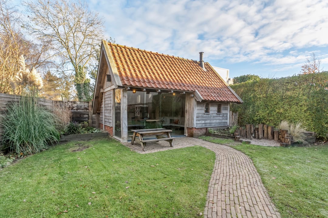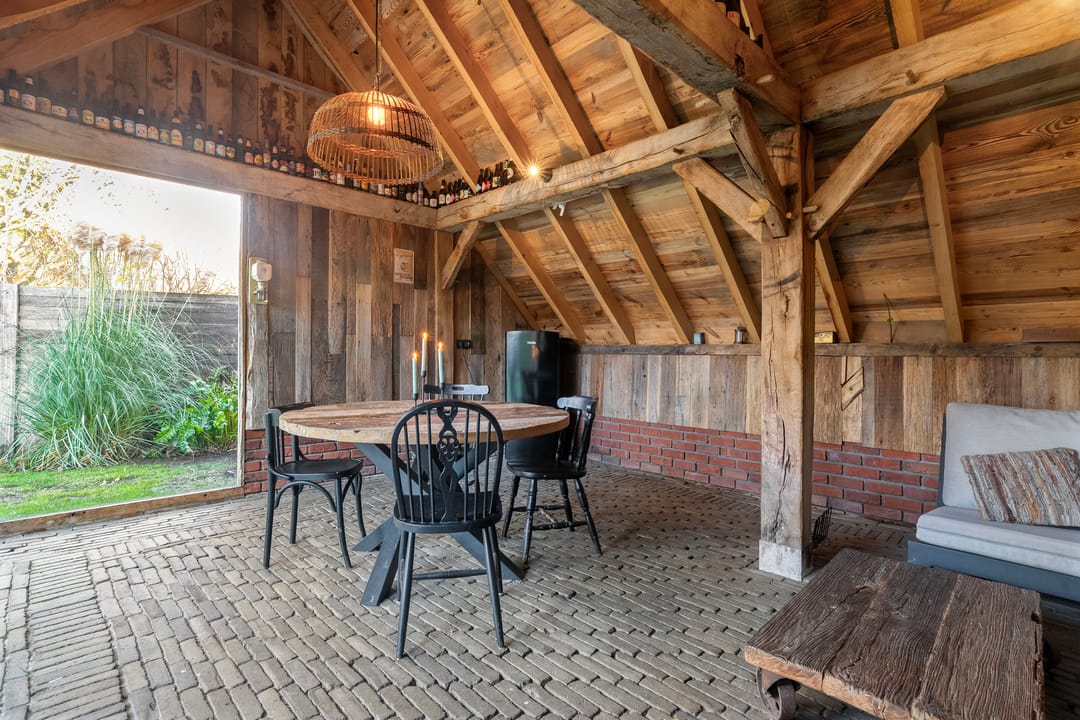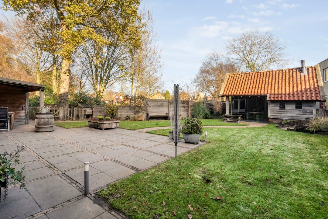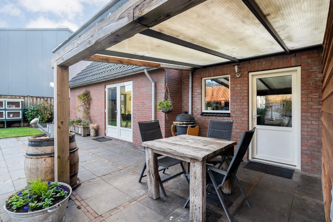 De tuin is een waar verlengstuk van de woning. De royale terrasoverkapping met glazen schuifdeuren en een ingebouwde haard maakt het tot een volwaardige buitenkamer, waarin je het hele jaar rond kunt genieten van rust, privacy en het uitzicht op de vrije omgeving.