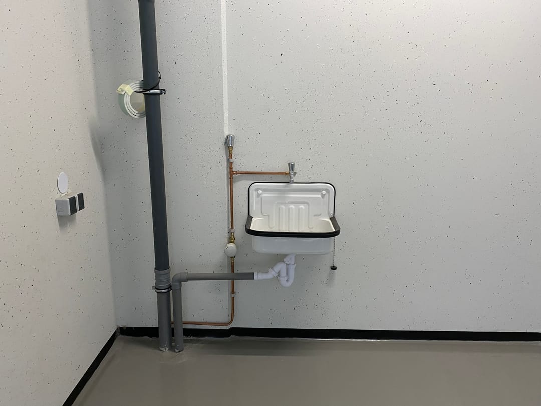- Wateraansluiting in de box met fonteintje, uitstortgootsteen en afvoer;