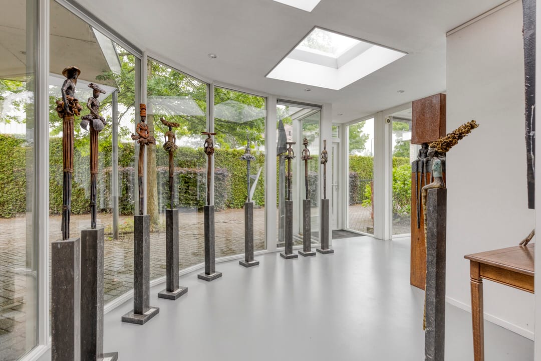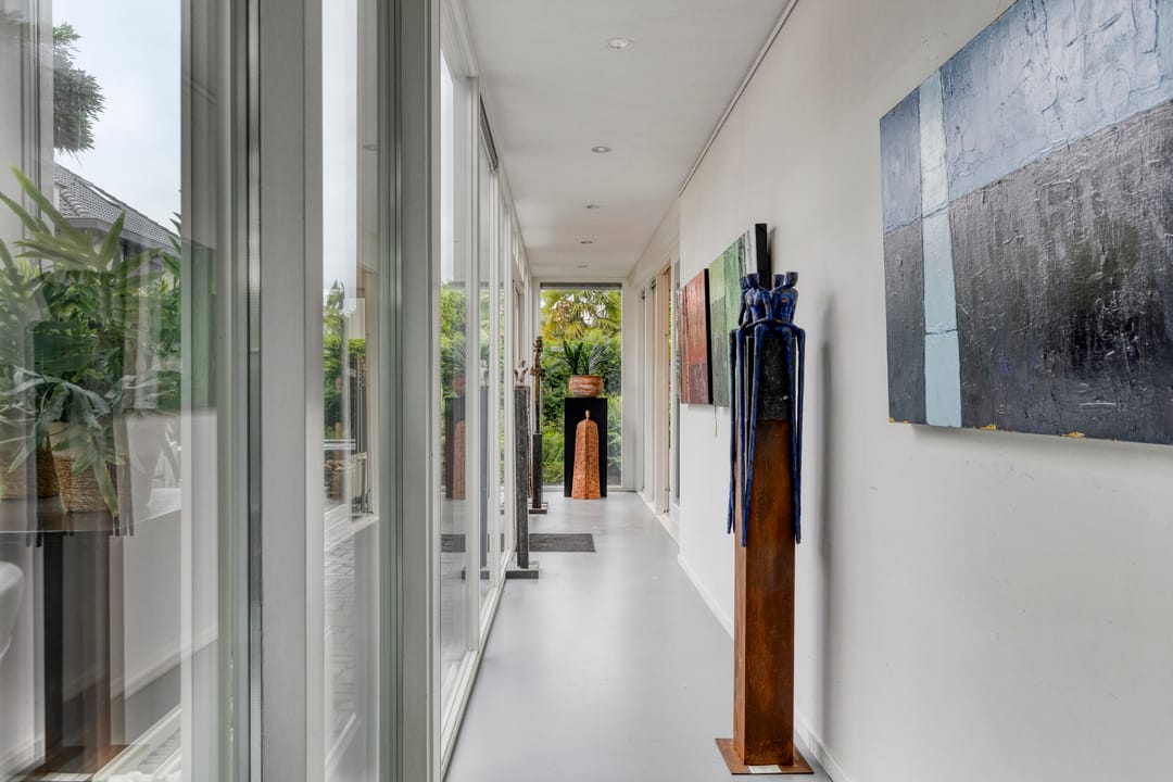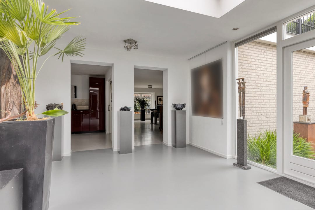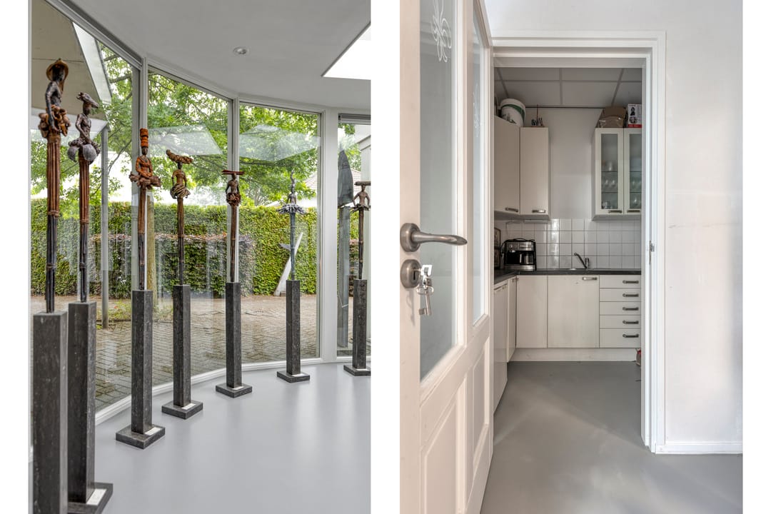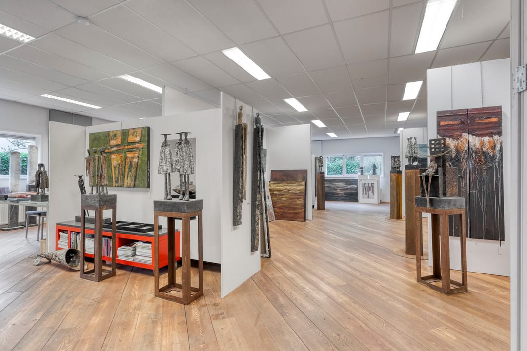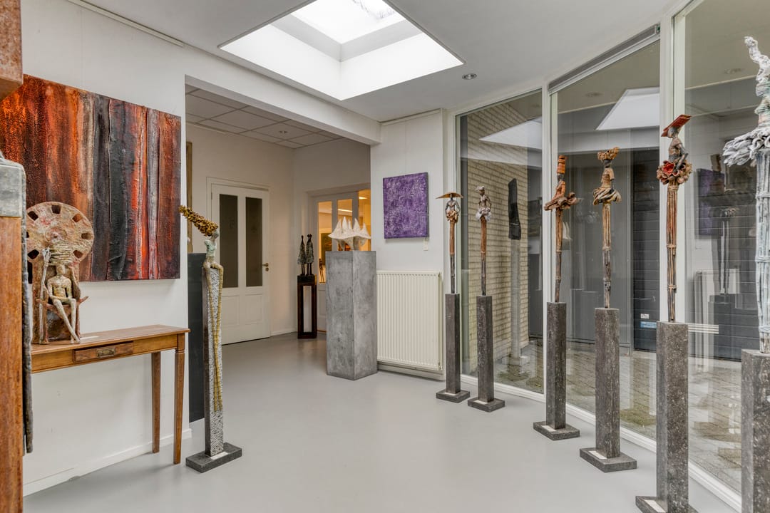 Fraaie eigen entree aan de zijkant, ook toegankelijk vanuit de serre met veel lichtinval door de grote glasoppervlaktes, pantry en toiletruimte, via een lange ‘’glazen’’ gang langs de tuin met openslaande tuindeuren te bereiken kantoorruimte die nu als atelier wordt gebruikt, vanuit het atelier en de entree te bereiken bedrijfshal die voor een gedeelte als galerie is ingericht e.e.a. met de gebruikelijke beveiligingsvoorzieningen. Aan de rechterzijde is een magazijnruimte met elektrische overheaddeur.