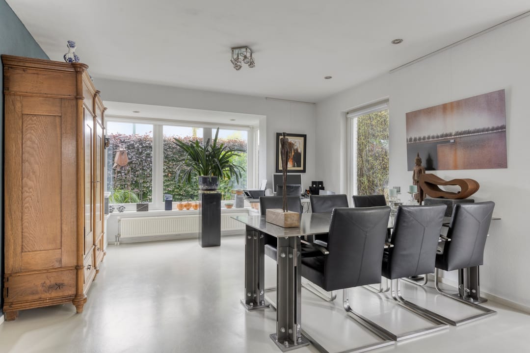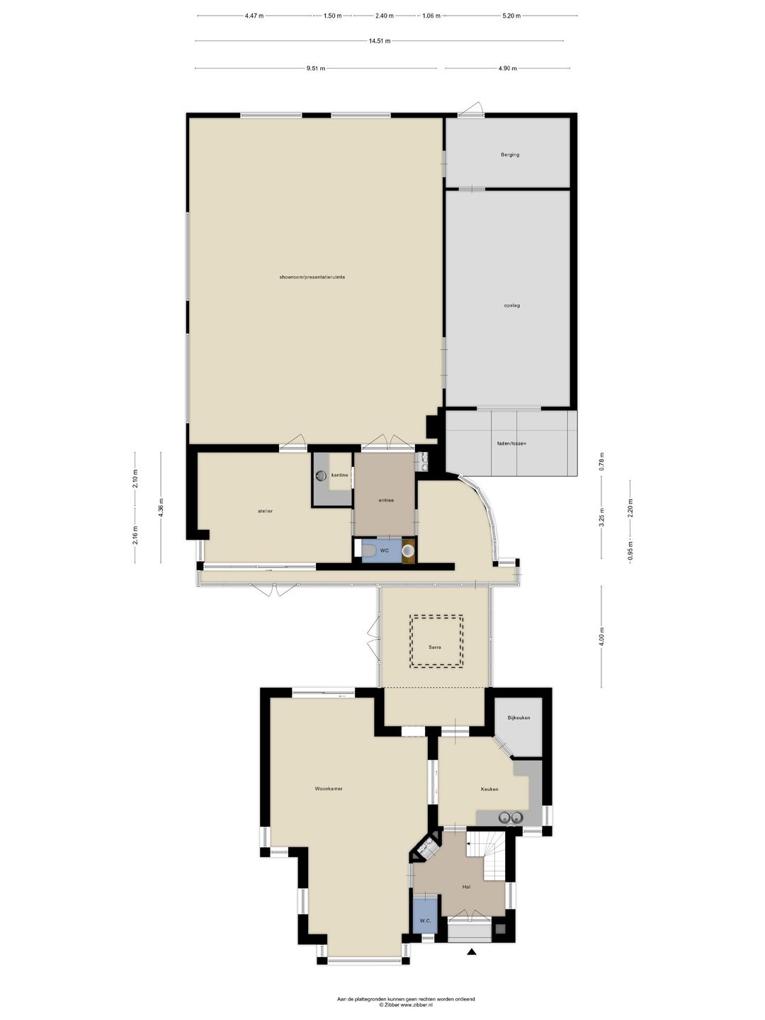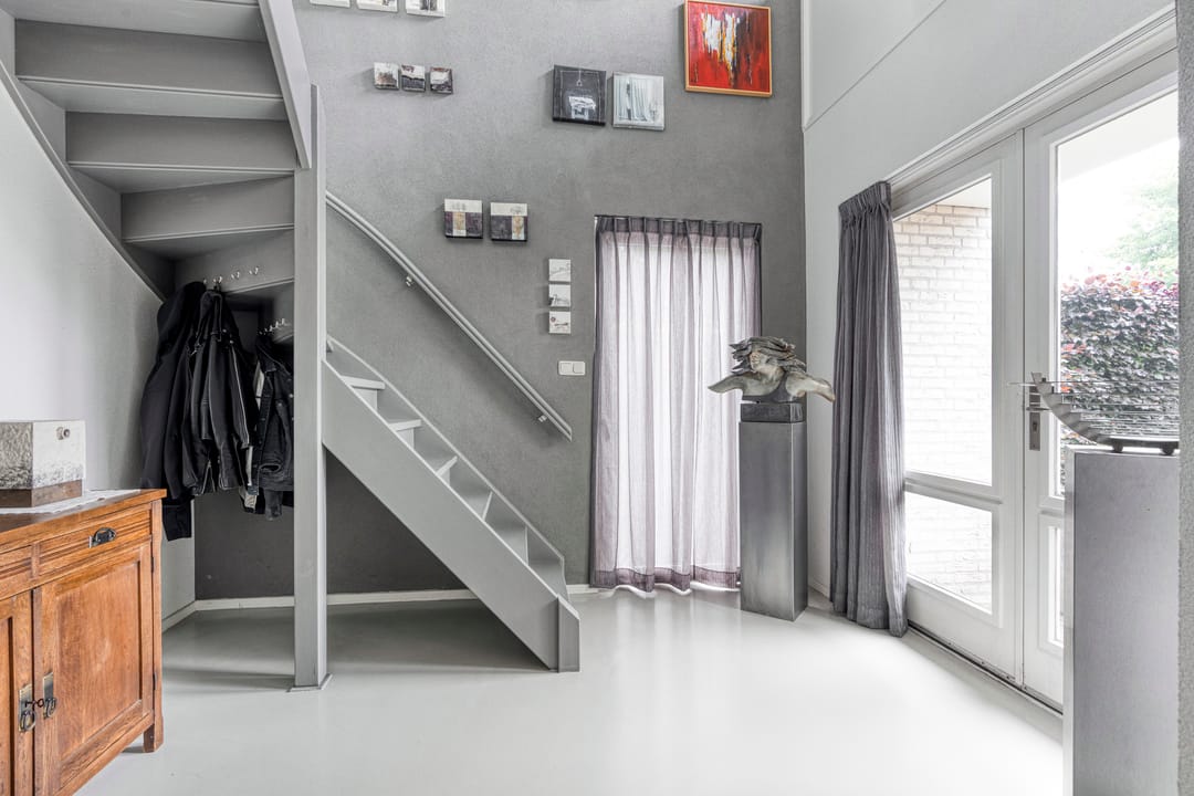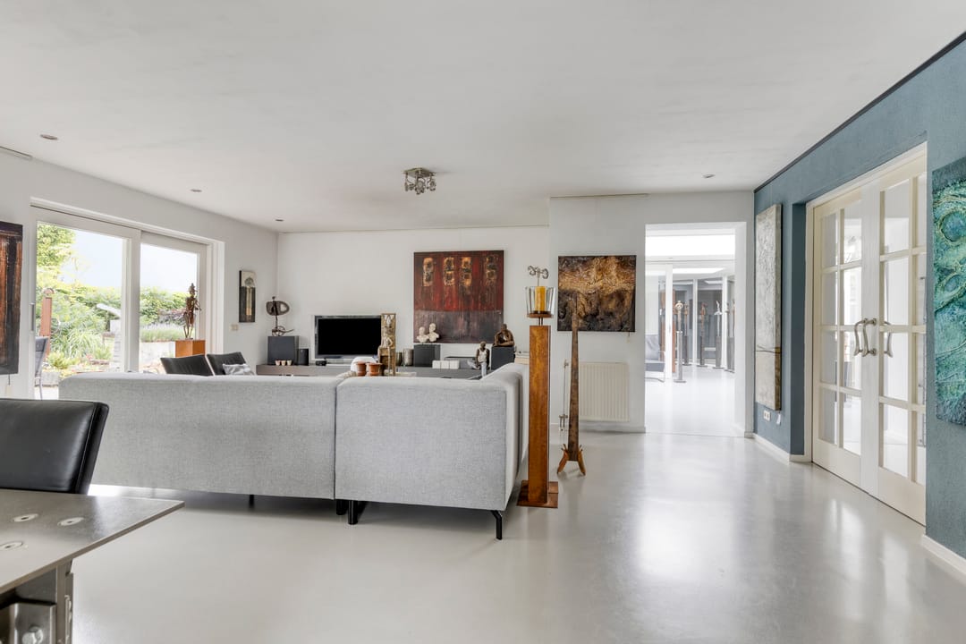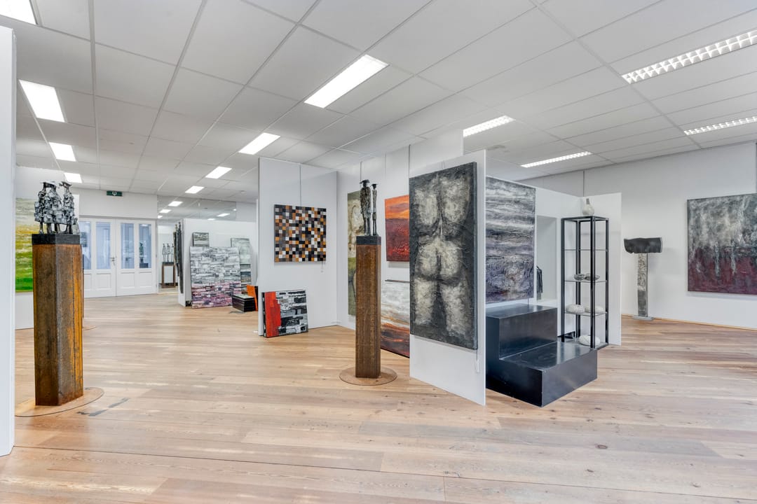 Fraaie eigen entree aan de zijkant, ook toegankelijk vanuit de serre met veel lichtinval door de grote glasoppervlaktes, pantry en toiletruimte, via een lange ‘’glazen’’ gang langs de tuin met openslaande tuindeuren te bereiken kantoorruimte die nu als atelier wordt gebruikt, vanuit het atelier en de entree te bereiken bedrijfshal die voor een gedeelte als galerie is ingericht e.e.a. met de gebruikelijke beveiligingsvoorzieningen. Aan de rechterzijde is een magazijnruimte met elektrische overheaddeur.