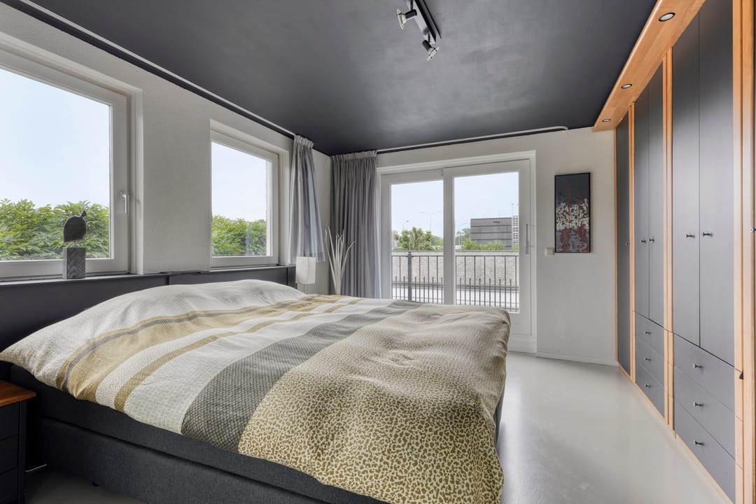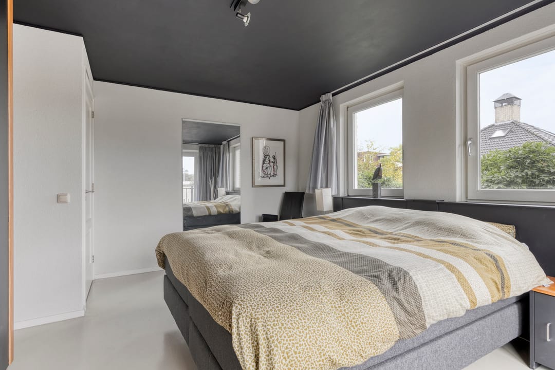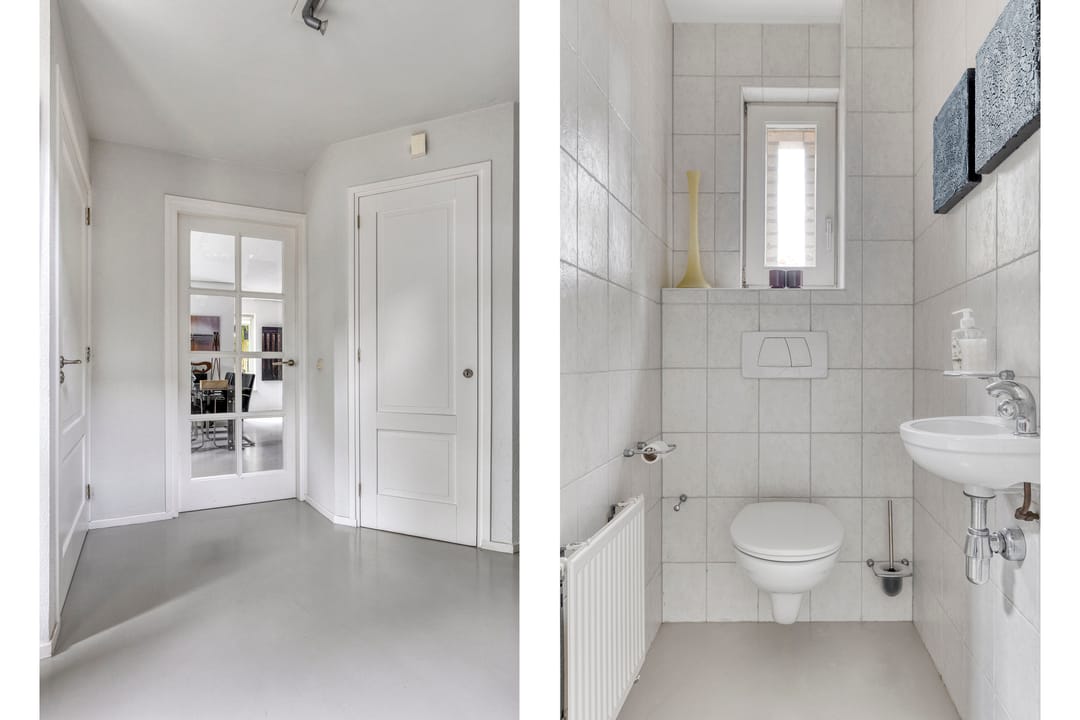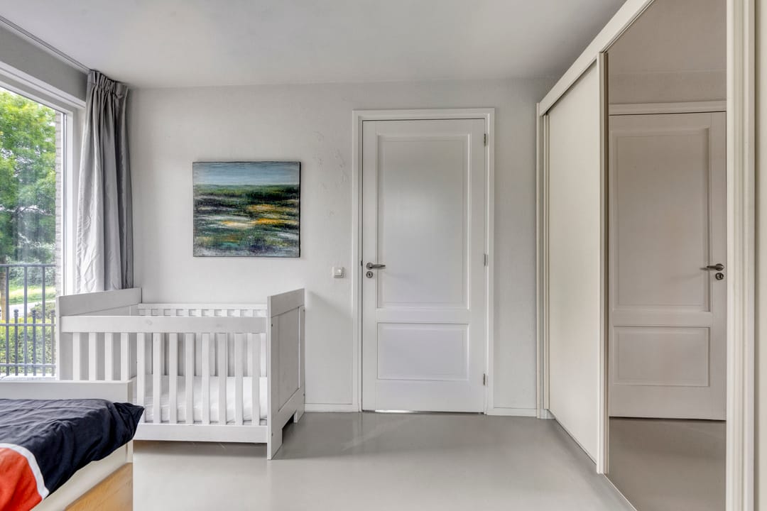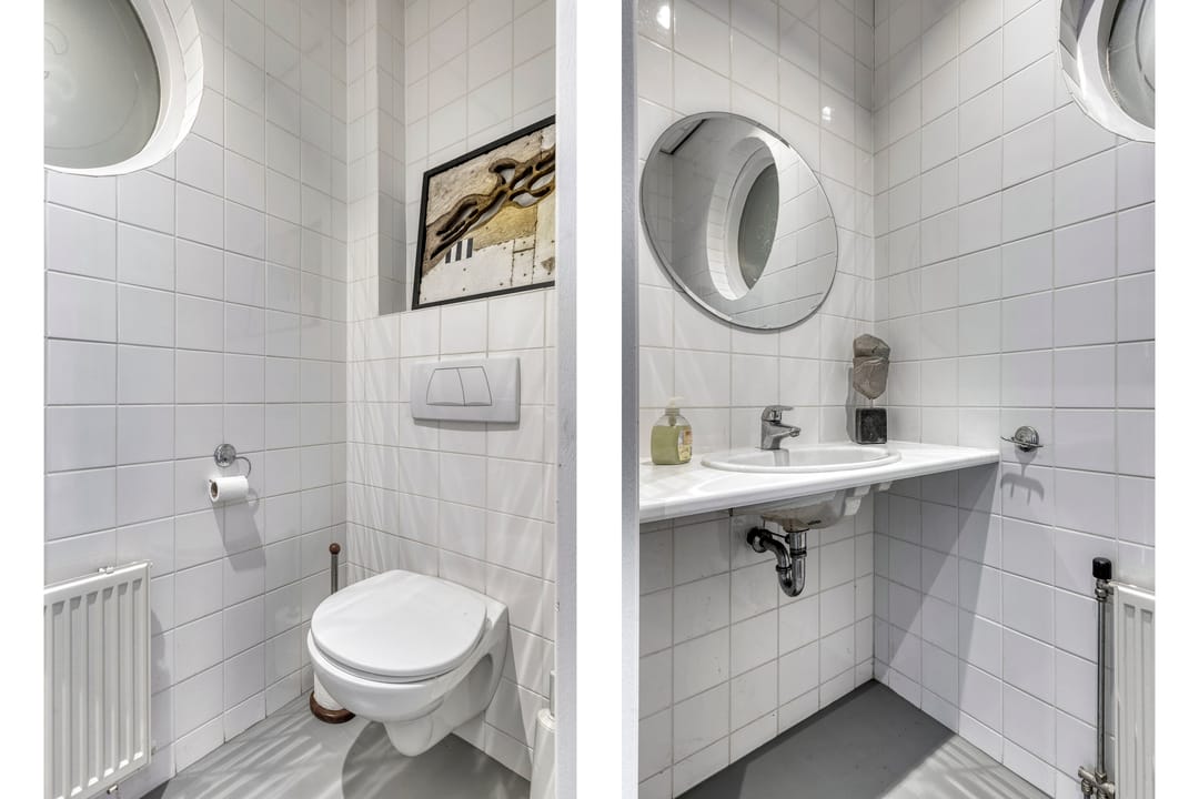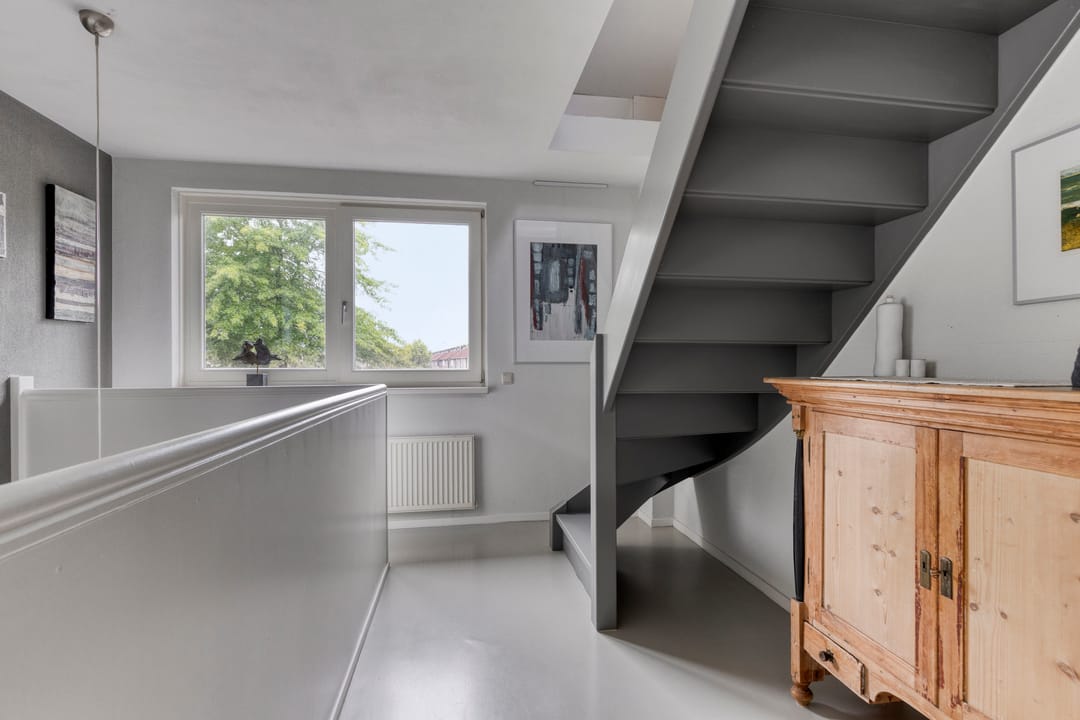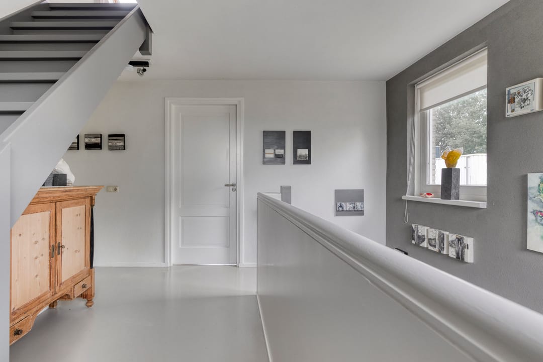 1e verdieping: overloop met een gietvloer (doorlopend over nagenoeg de gehele verdieping), twee slaapkamers aan de achterzijde waarvan één met een schuifpui, geheel betegelde badkamer met een ligbad, douchehoek, wastafel en een vrijhangend toilet.
