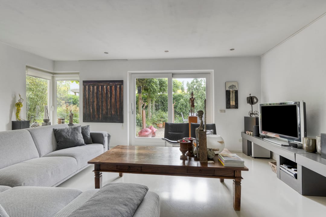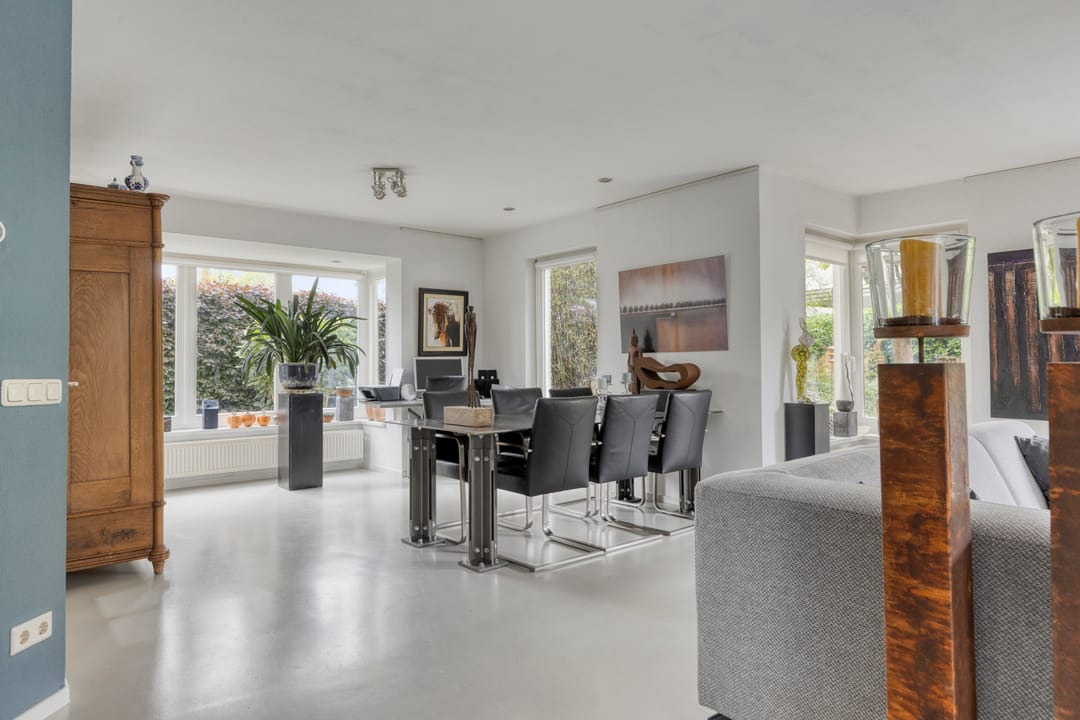 Begane grond: entree/hal met de trapopgang, meterkast en een toiletruimte met een vrijhangend toilet en fonteintje, grote living met een erker, schuifpui en een gietvloer over de gehele begane grond met vloerverwarming, via schuifdeuren-en-suite te bereiken keuken met een keukeninrichting in hoekopstelling voorzien van 'alle' inbouwapparatuur, bijkeuken met de c.v.-installatie, serre aan de achterzijde met glas rondom, een grote lichtkoepel en openslaande tuindeuren.