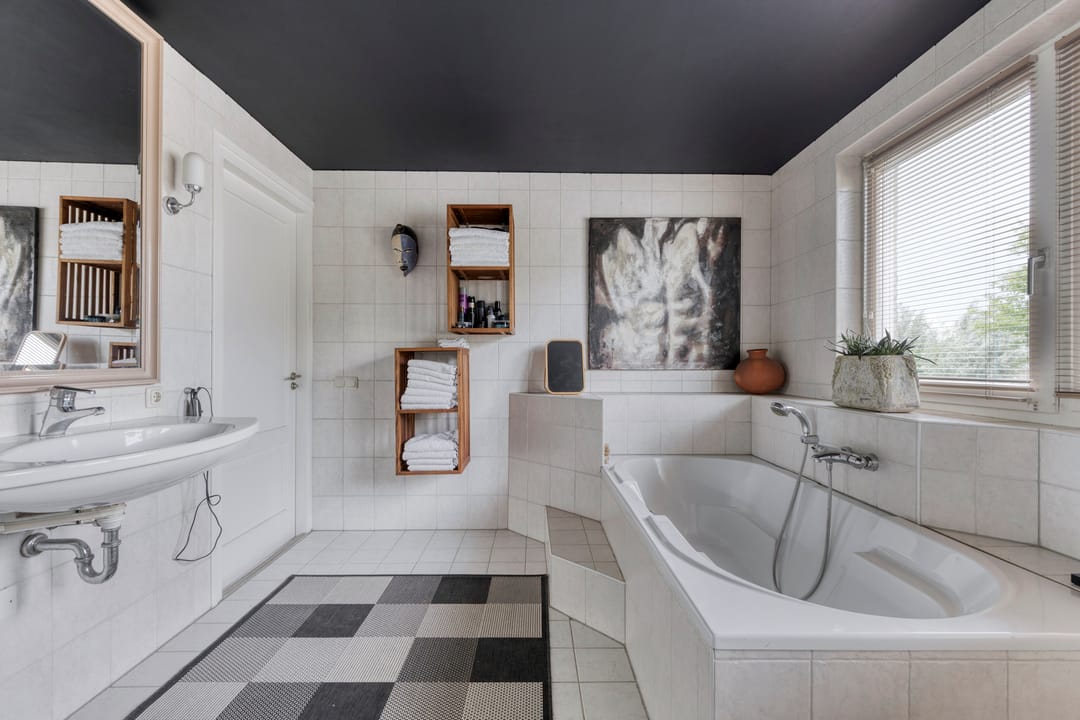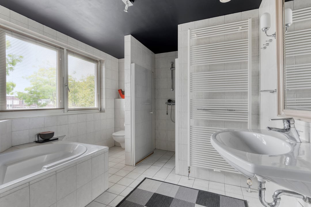 - Badkamer met ligbad, douchehoek, wastafel en toilet;