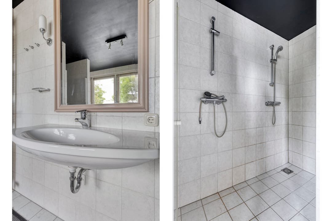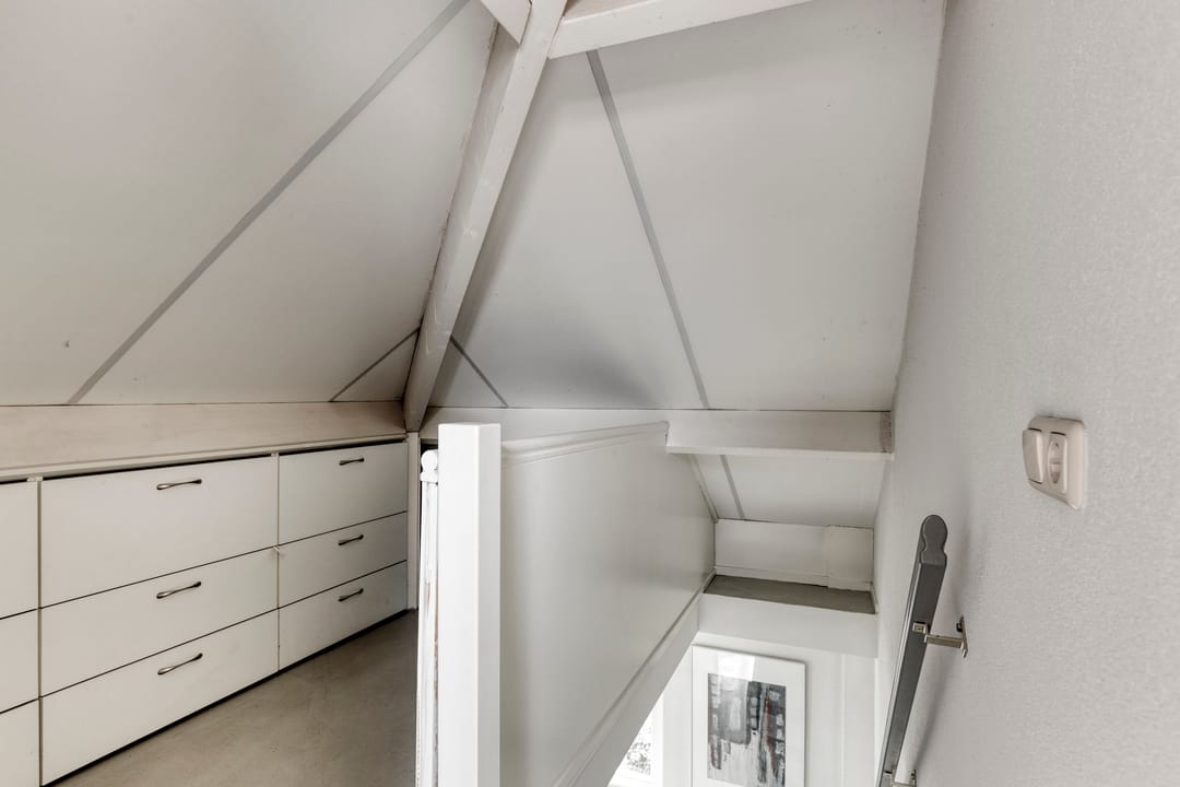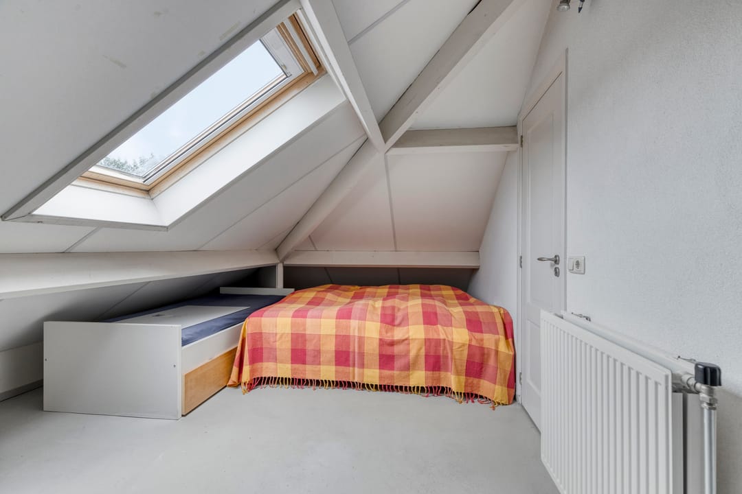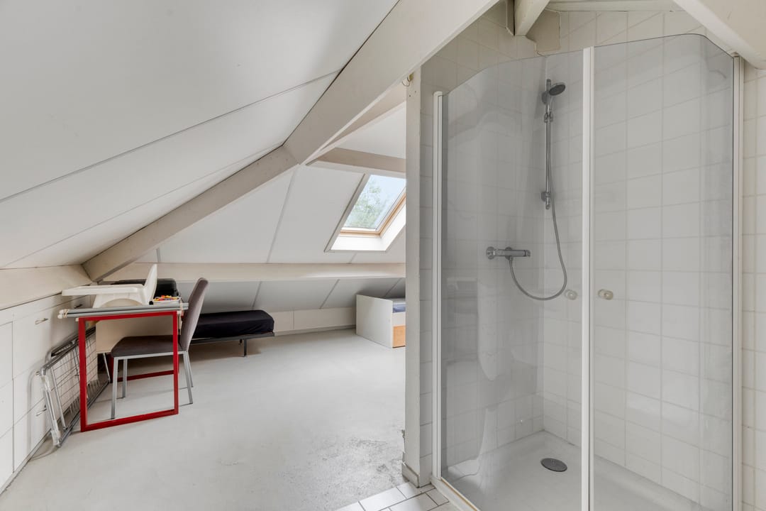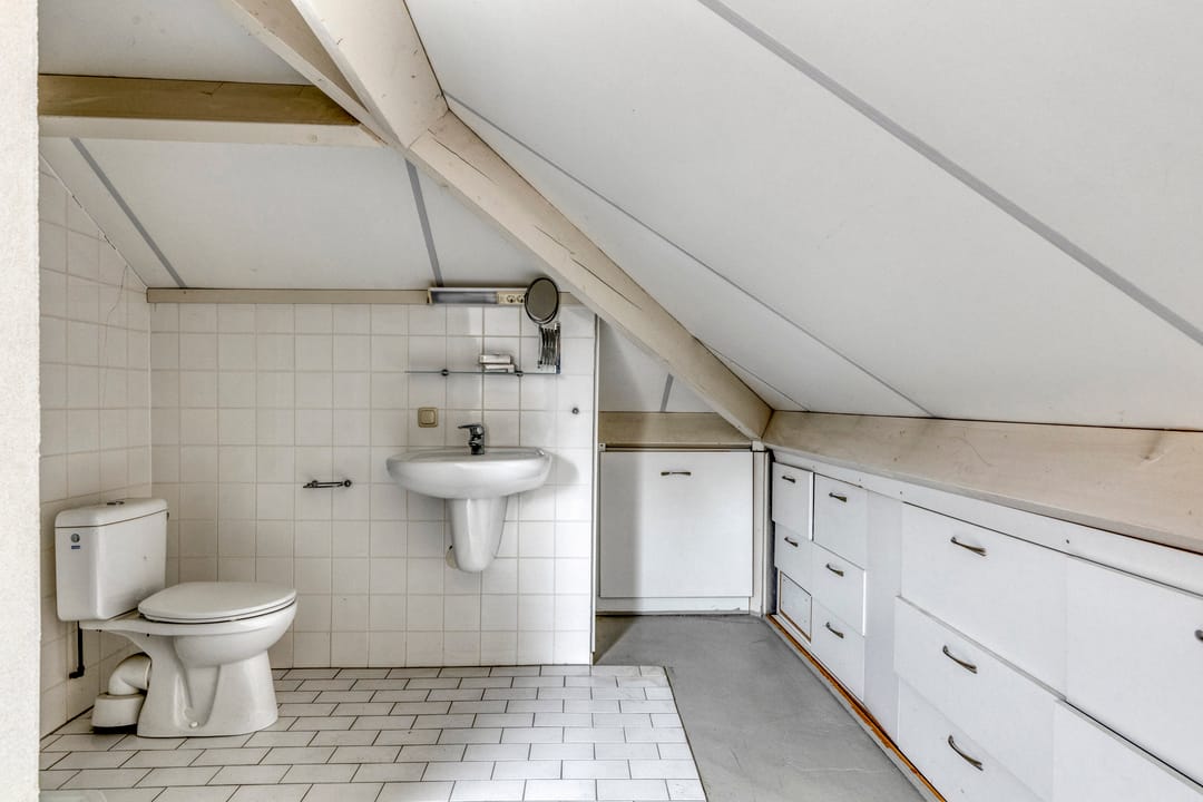 2e verdieping: via een vaste trap te bereiken zolderkamer met een daktuimelraam, een toilet, wastafel en een douchecabine.