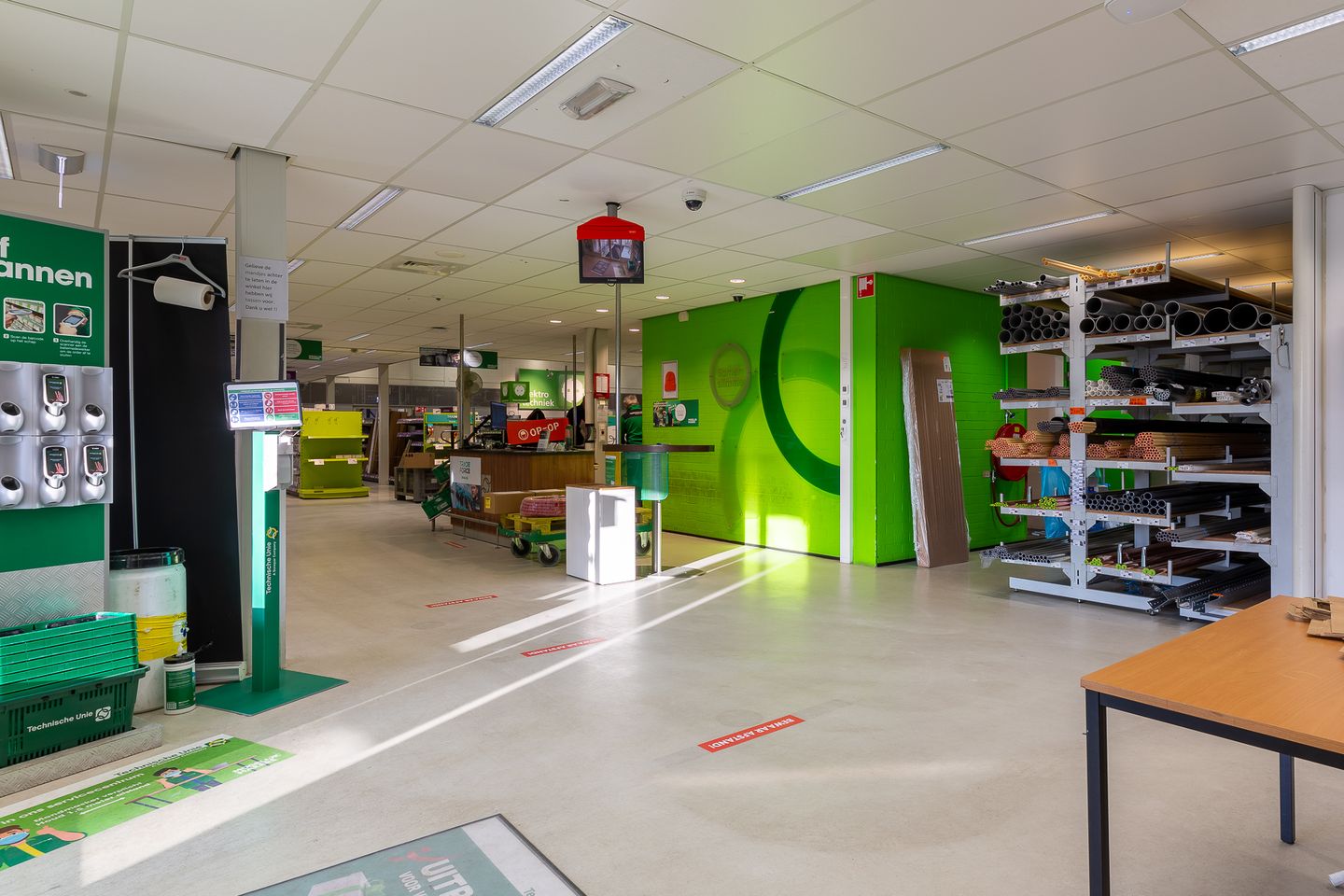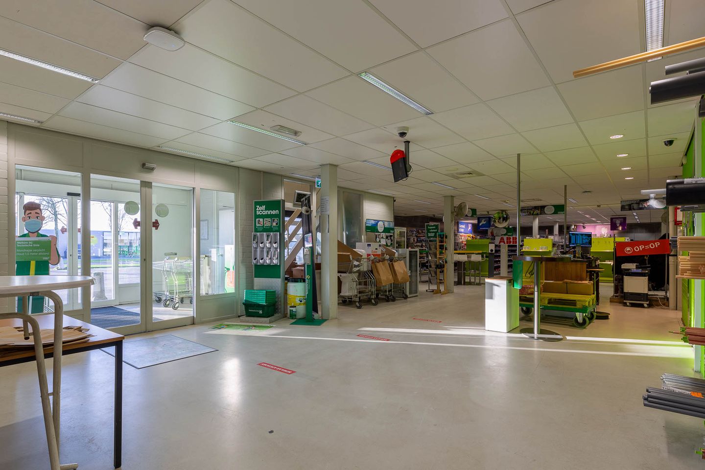Aan de voorzijde van het pand is de hoofdingang gesitueerd welke direct zicht heeft op de winkel en de showroom. De winkel en de showroom hebben een vrije hoogte van 5,85 en 5,90 meter. Aan de rechterzijde van de hoofdingang bevindt zich nog één kantoorruimte tezamen met een receptie en een afrekenbalie. Zowel het kantoor als de receptie en de afrekenbalie hebben een verlaagd systeemplafond met TL- armaturen.