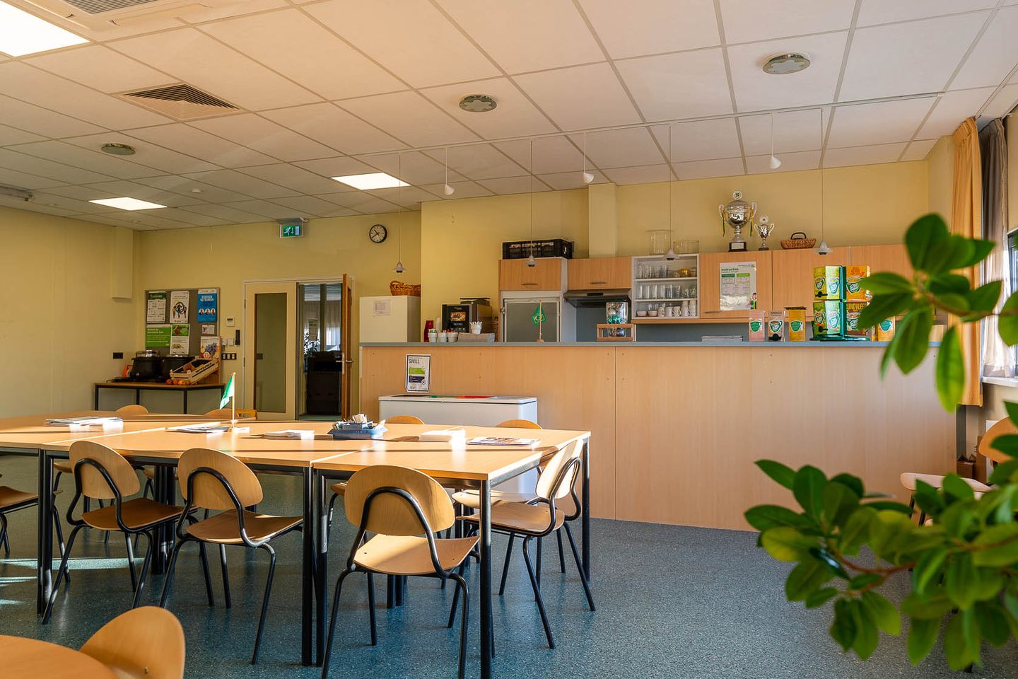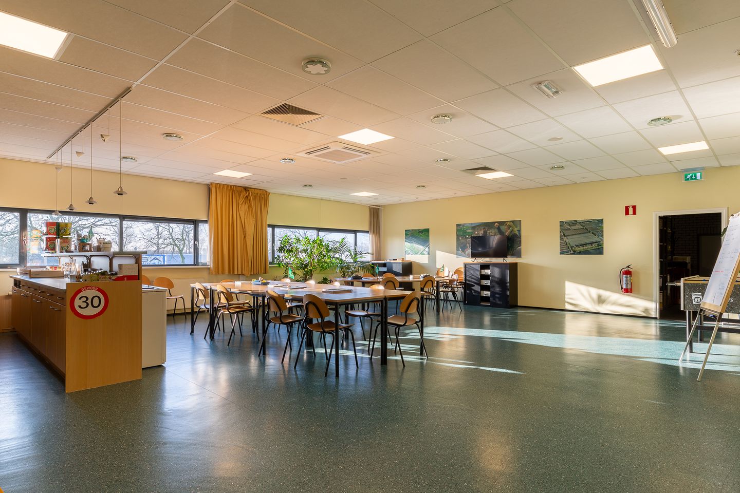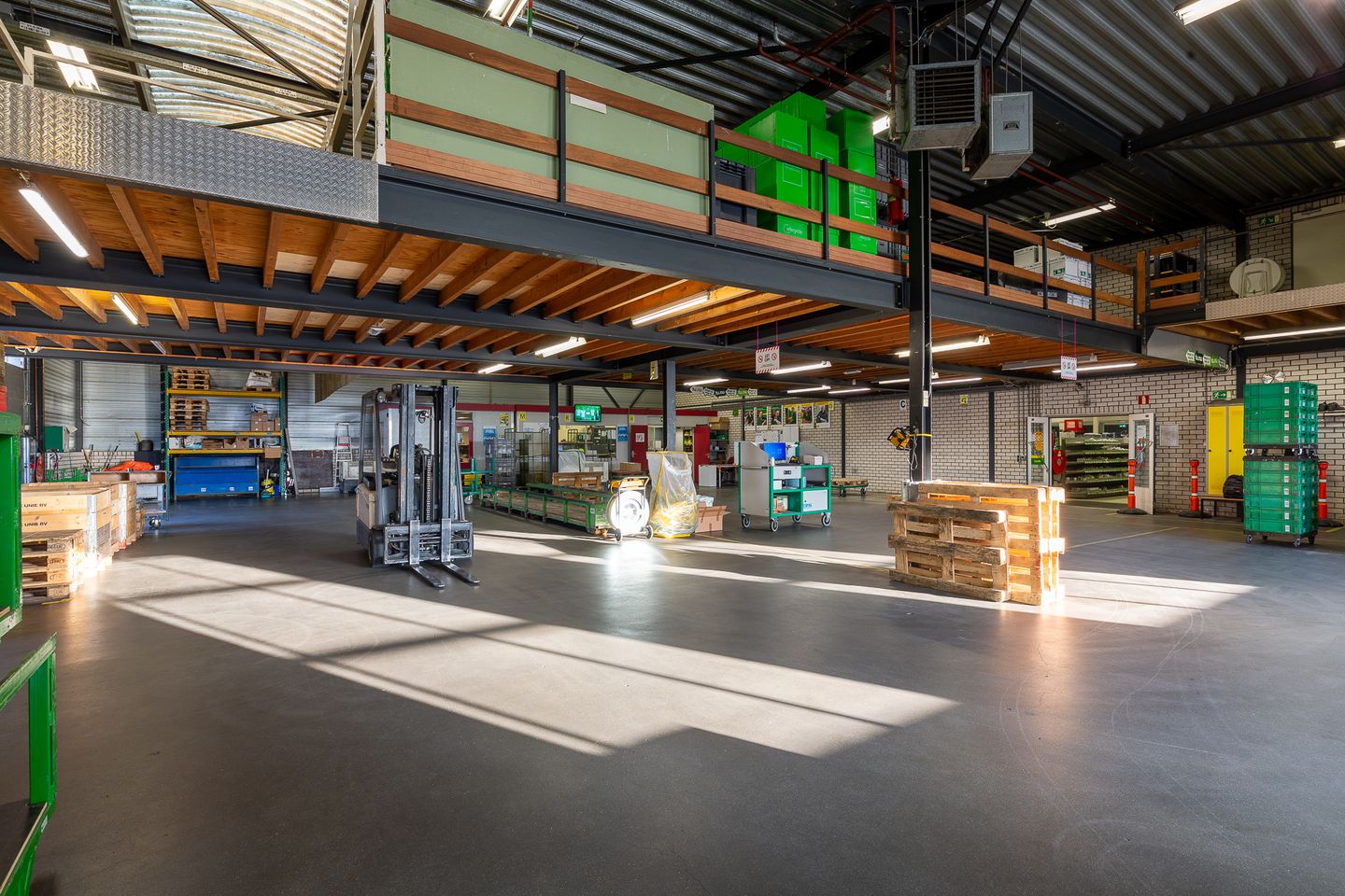 Vanaf de overloop op 1e verdieping bevinden zich aan de linkerzijde; de kantine met keukenopstelling, een doorloop naar de opslagruimte en de eerder genoemde houten verdiepingsvloer. Aan de rechterzijde bevinden zich de kantoortuin tezamen met twee afsluitbare vergaderruimtes.