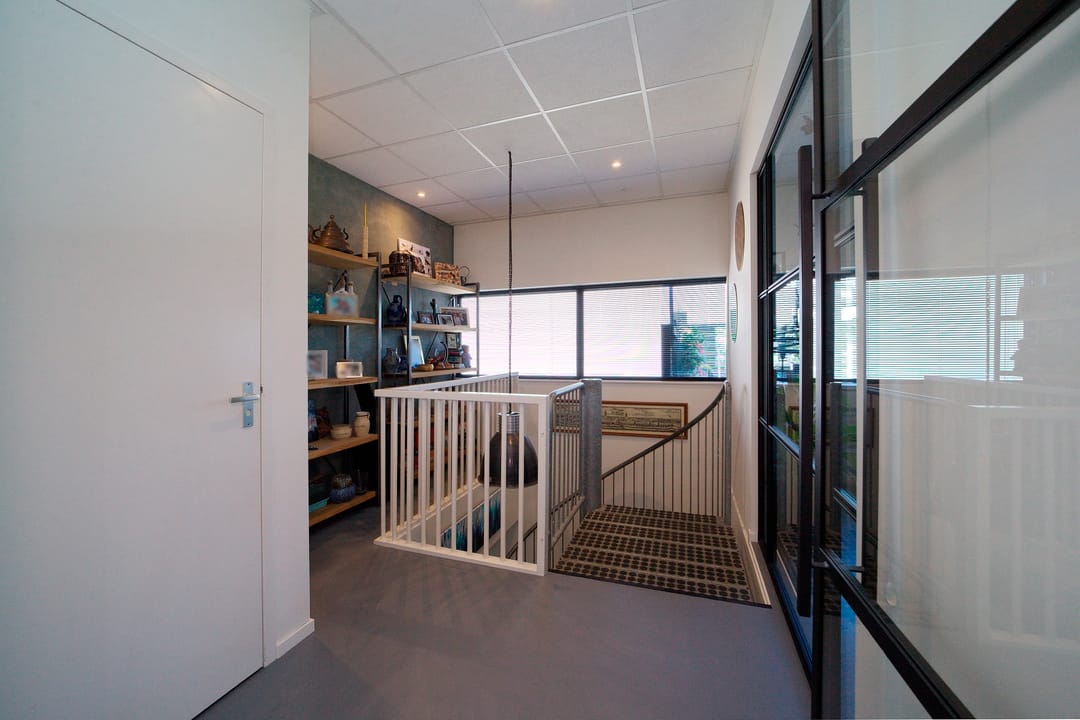De eerste verdieping (106 m²) is volledig ingericht als representatief kantoor met moderne faciliteiten. Deze etage omvat ruime kantoorruimtes, een functionele keuken met diverse keukenapparatuur, sanitaire voorzieningen en flexibele opslagruimtes. Het aangrenzende dakterras van 43 m² biedt mogelijkheden voor pauzeruimte of zakelijke bijeenkomsten.