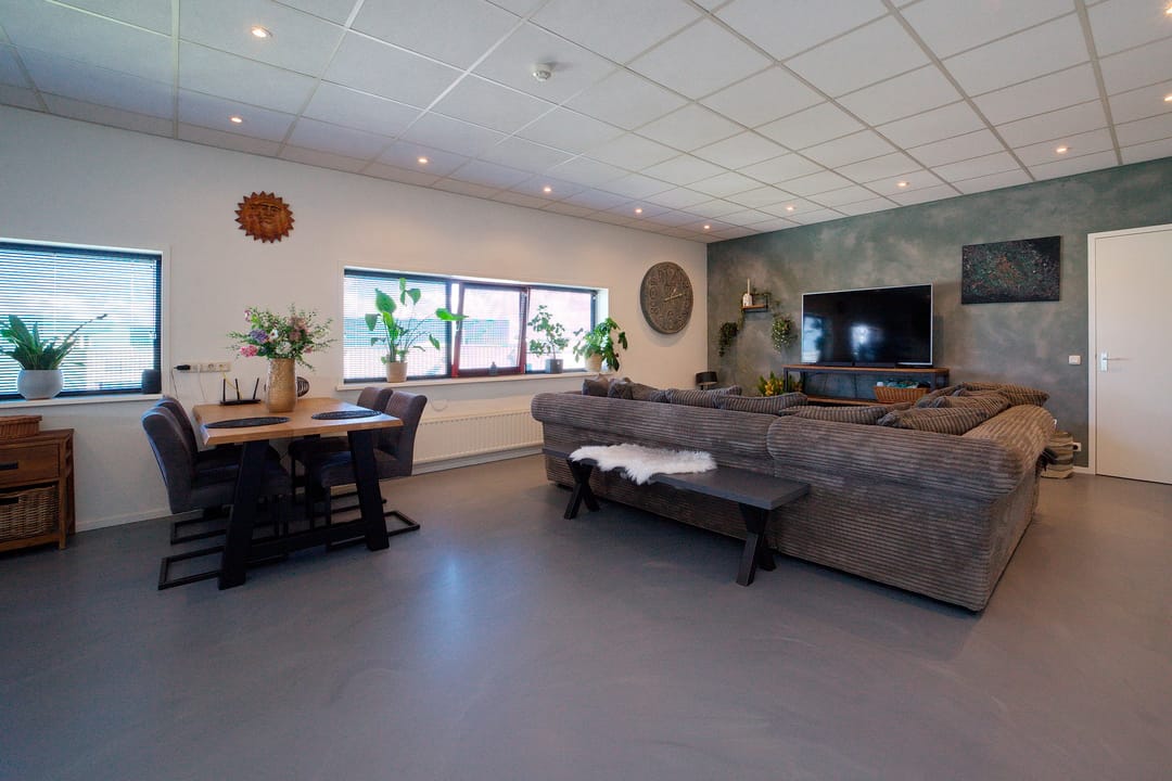 De begane grond herbergt een bedrijfshal van 138 m² met praktische voorzieningen zoals een elektrisch bedienbare overheaddeur en luchtverwarming door middel van een heater. De tussenvloer van 56 m² biedt aanvullende opslagruimte, terwijl de overdekte buitenopslag zorgt voor extra logistieke mogelijkheden.