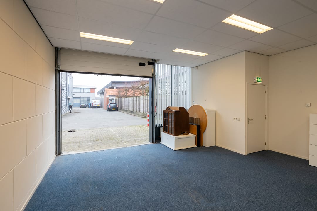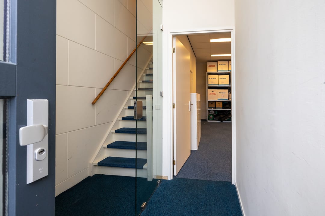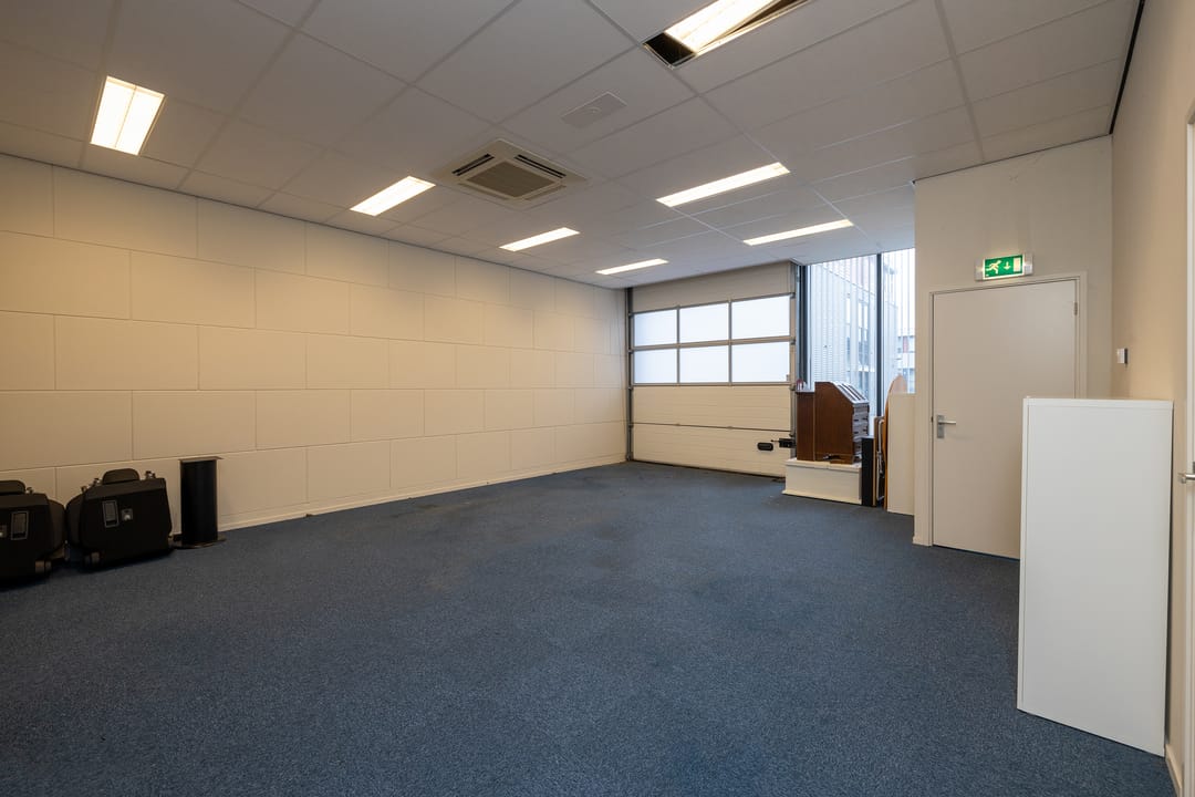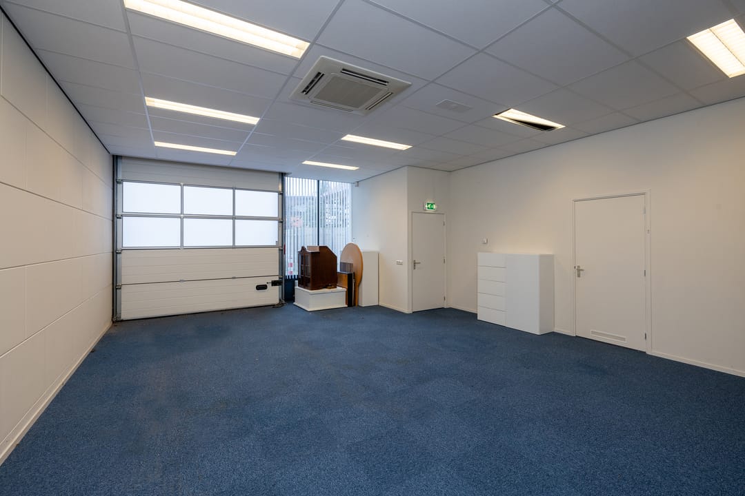 Via de loopdeur komt u een halletje waar u enerzijds naar de afgesloten bedrijfsruimte kunt of anderzijds middels de fraaie glazen deur de trap naar de kantoorruimte op de eerste verdieping bereikt. De bedrijfsruimte kent een behoorlijk luxe afwerkingsniveau wat grotendeels veroorzaakt wordt door het aanwezige systeemplafond met verlichting en de vloerbedekking. Verder is de bedrijfsruimte voorzien van een prima overheaddeur, een toilet met wastafel en douche, verwarming, een pantry en airconditioning.