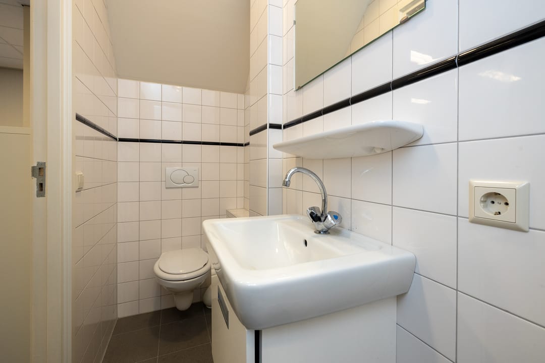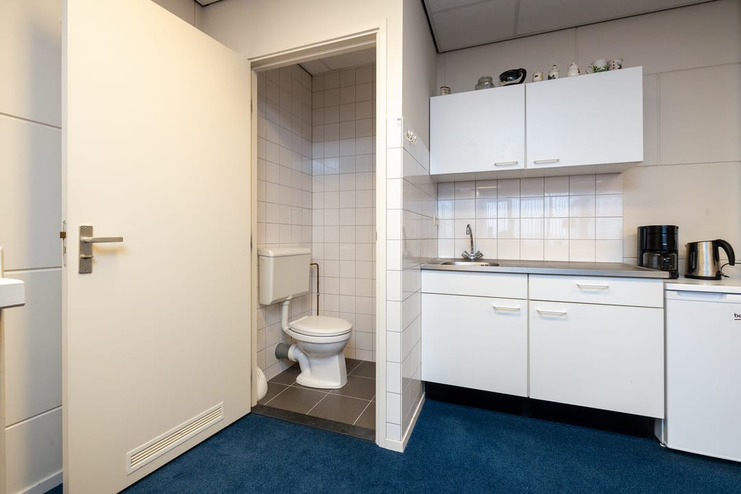Door de afgesloten trapopgang en de voorzieningen op de eerste verdieping is de kantoorruimte in principe separaat van de begane grond te gebruiken. De ruimte heeft over de volle breedte ramen waardoor er een aangenaam werkklimaat ontstaat. Verder is de ruimte voorzien van een systeemplafond met verlichting, een kabelgoot, een radiatorverwarming, een pantry, toilet, airconditioning en een raam in de zijgevel wat voor extra daglicht zorgt. Ook de verdieping is voorzien van een vloerbedekking. De c.v. ketel is in een kast op deze verdieping gemonteerd.