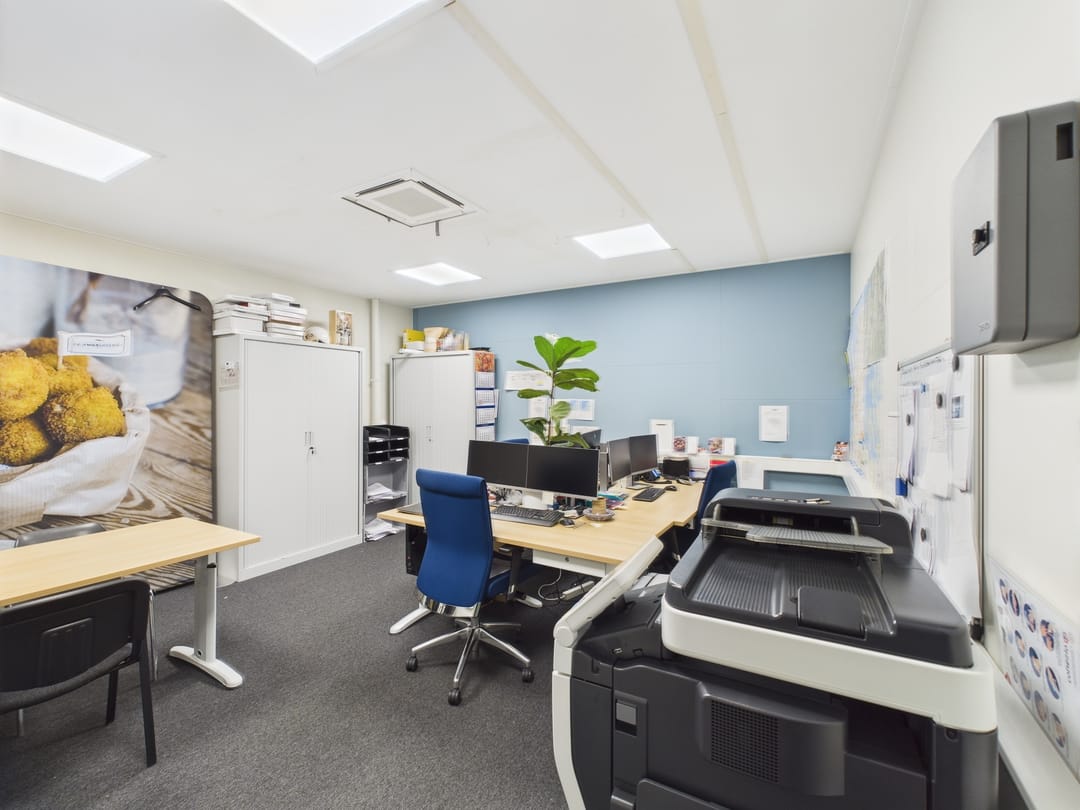 De begane grond heeft een oppervlakte van 68 m², met 35 m² extra kantoor- of opslagruimte op de verdieping (met airco).