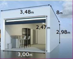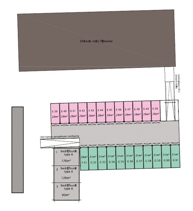 - Unit G39: 28m2; (L: 8,00 m, B: 3,48 en H: 2,98 m)