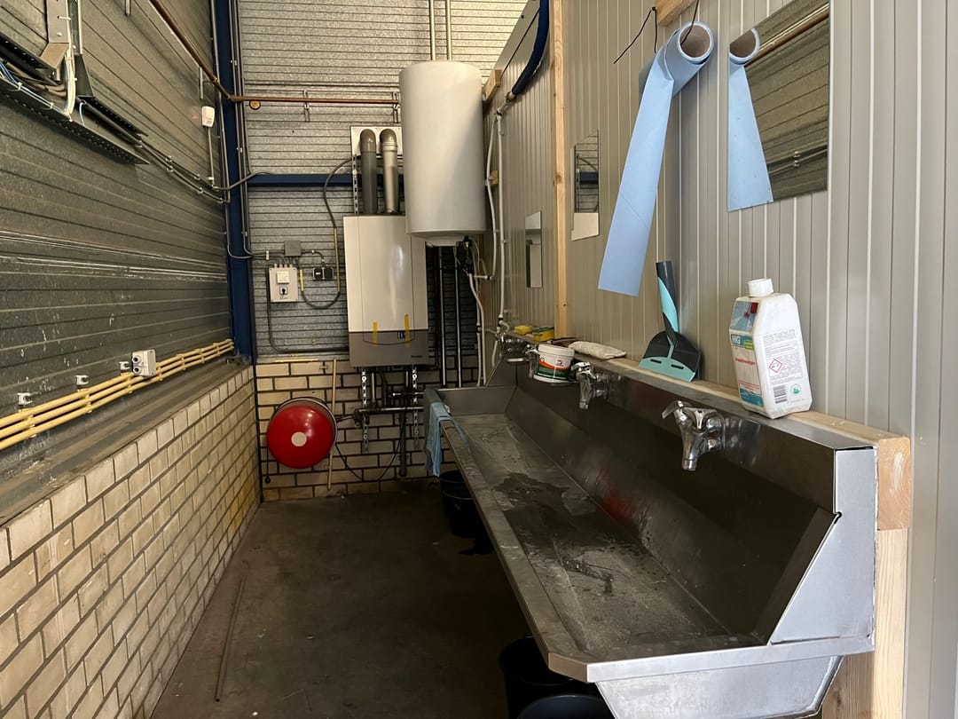 - Overheaddeuren, betonvloer, heater, toilet en pantry