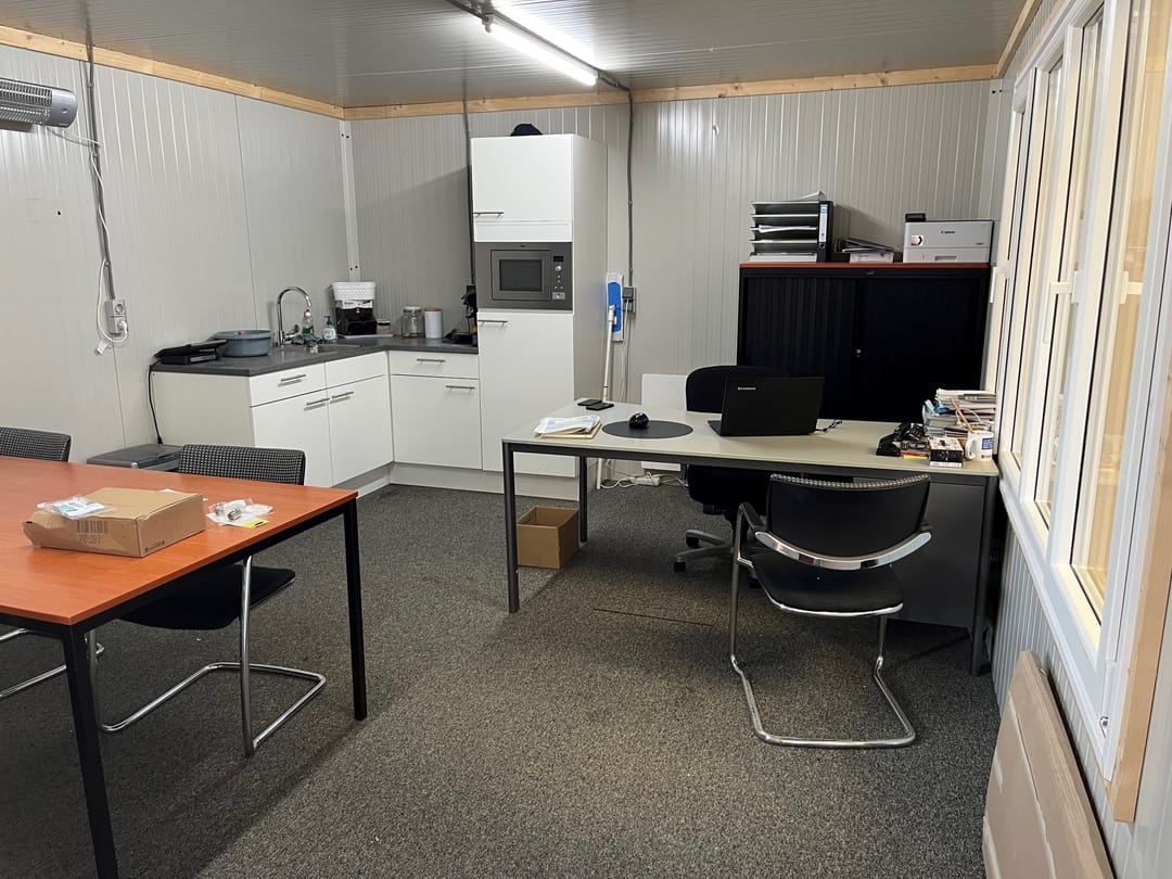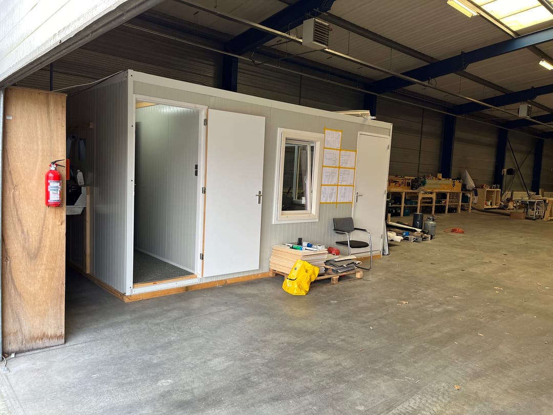 Deze loods is voorzien van een inpandige (evt. verplaatsbare) kantoorunit met kleine pantry met een totale oppervlakte van ca. 5x5= ca. 25 m².