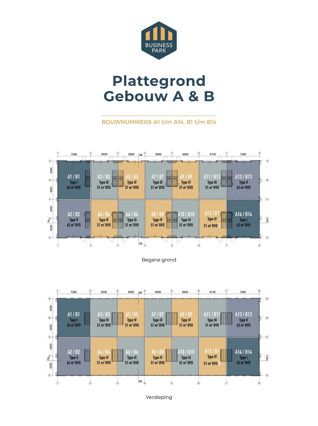De tussenunits zijn uitgerust met een elektrisch bedienbare overheaddeur, volledige verdiepingsvloer en heeft voldoende parkeermogelijkheden. Als alternatief, wordt een glazen vaste pui aangeboden in plaats van een overheaddeur.