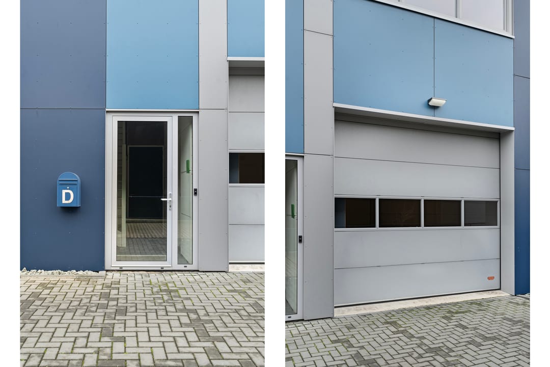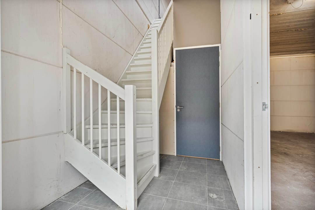 Separate entree/hal, meterkast, toilet, trapopgang naar de eerste verdieping en toegang tot de bedrijfsruimte welke voorzien is van een elektrisch bedienbare sectionaaldeur (krachtstroom), een gevlinderde betonvloer en een pantry.