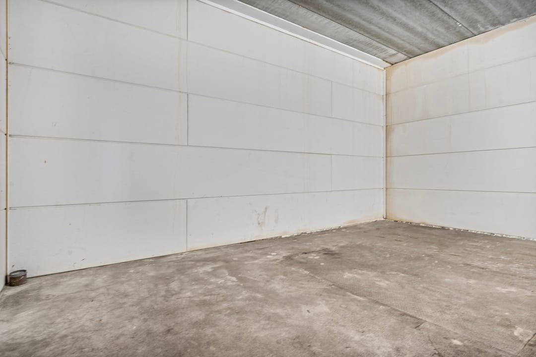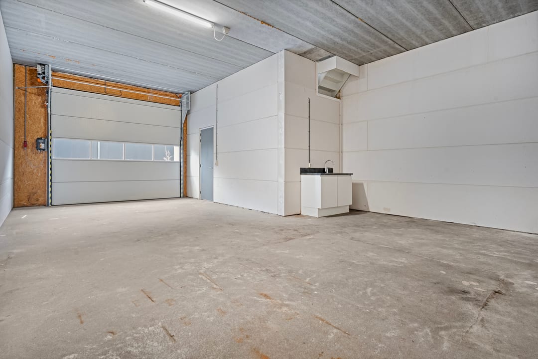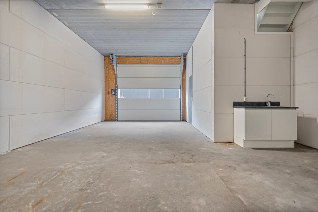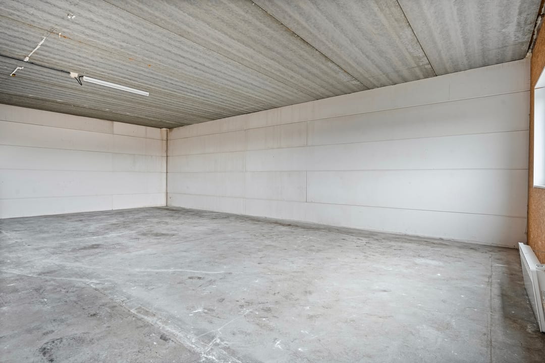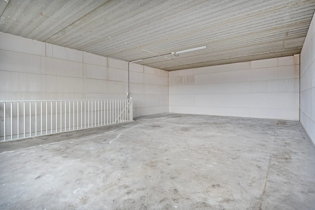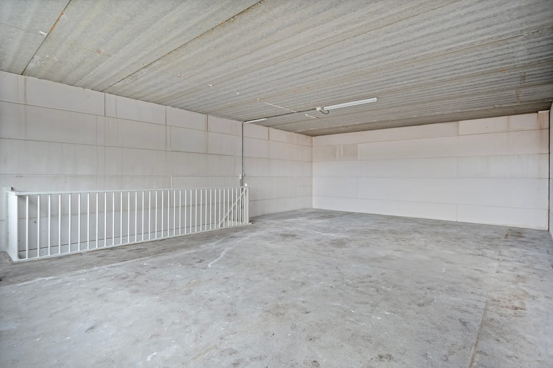 - Overheaddeuren, betonvloer, toilet, pantry en te openen ramen