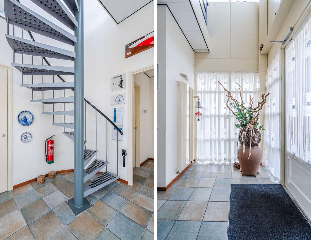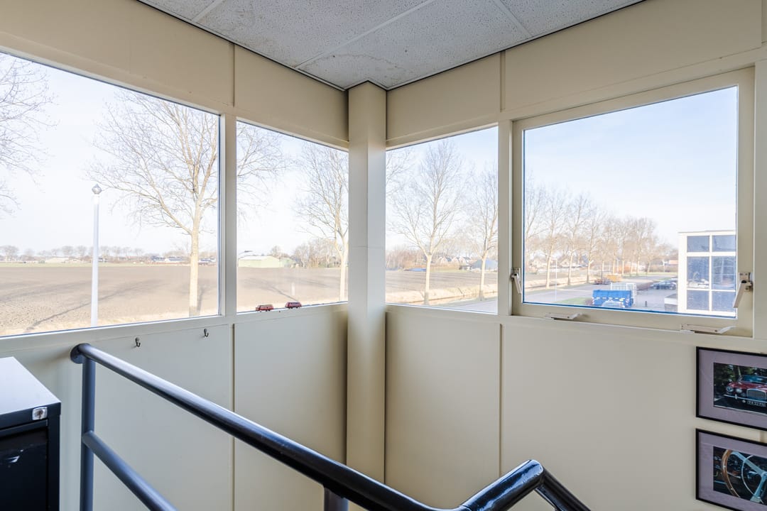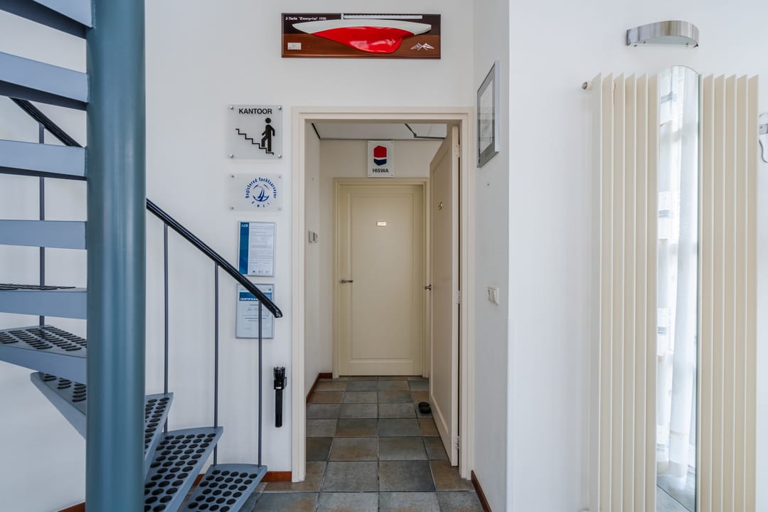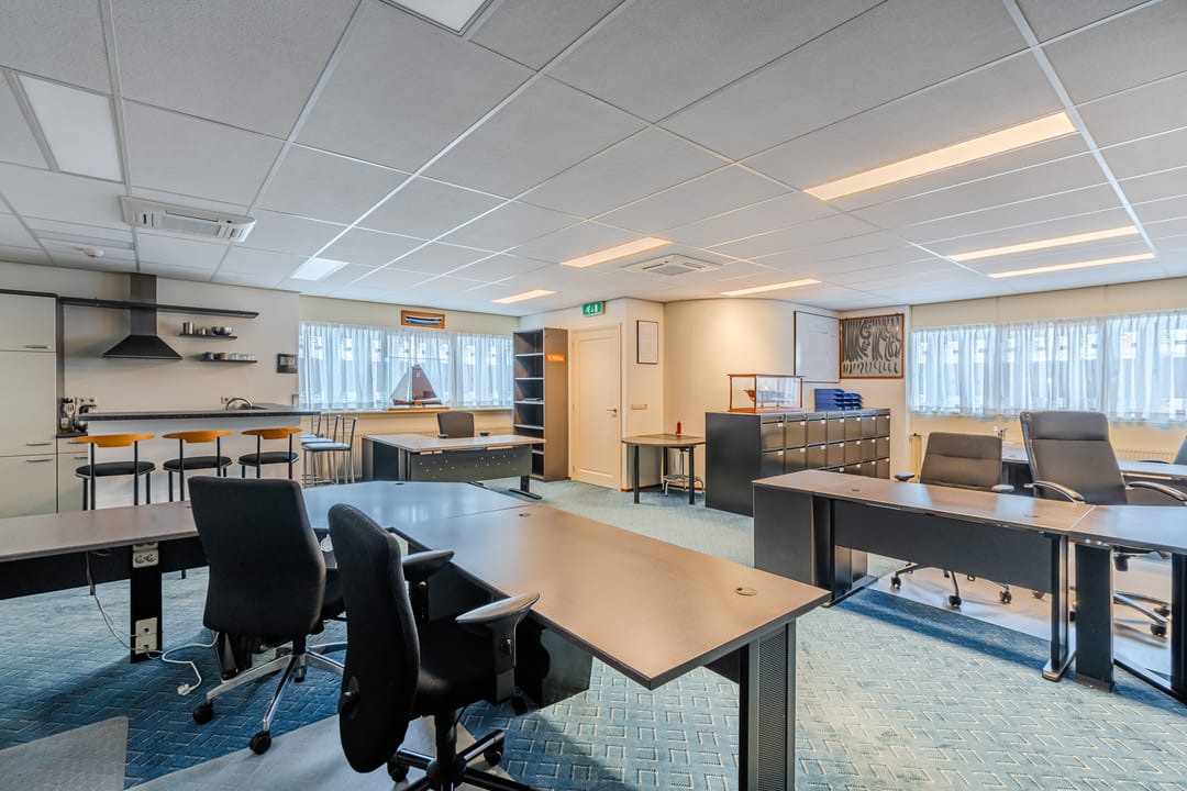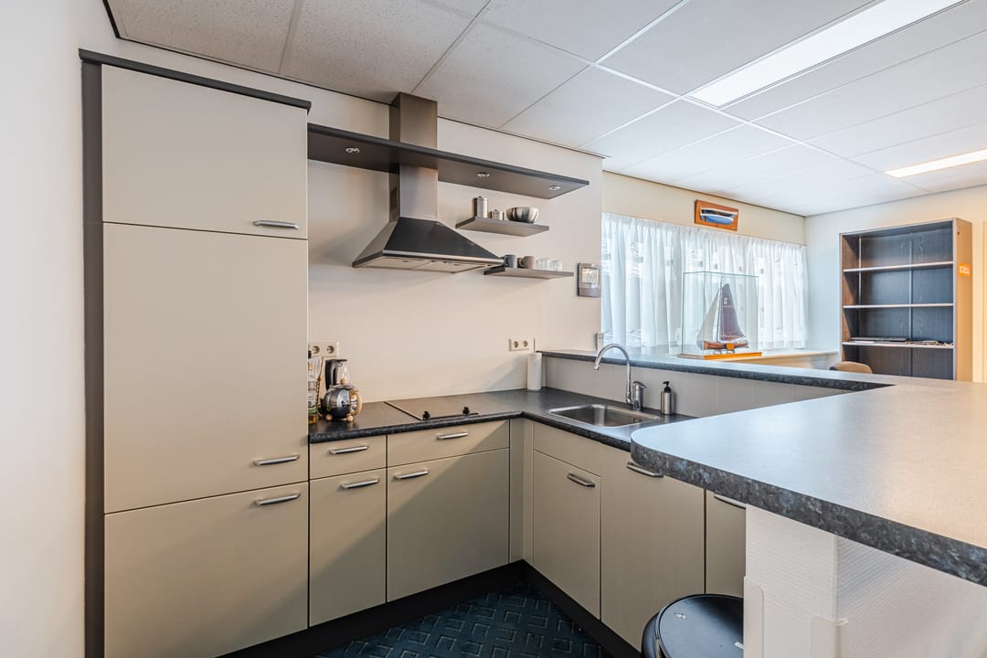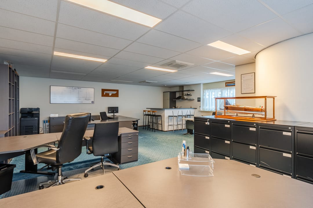 De kantoorverdieping biedt meerdere nette kantoorruimten, een pantry en sanitaire voorzieningen.