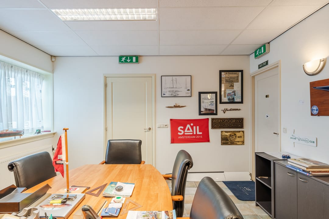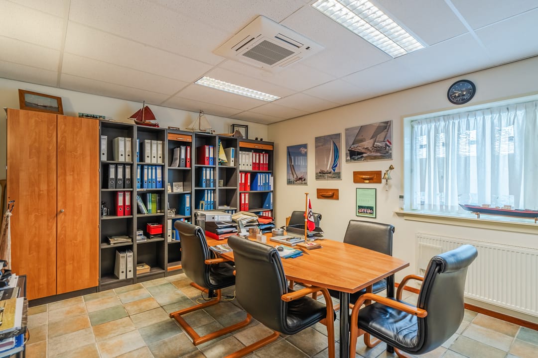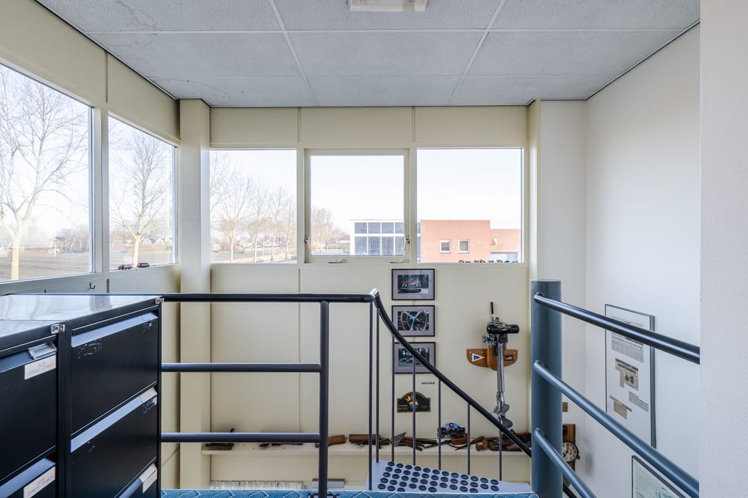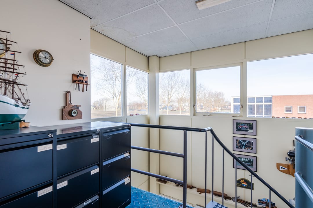 Het pand is praktisch ingedeeld. De bedrijfsruimte op de begane grond is voorzien van een elektrisch bedienbare overheaddeur en is tevens intern bereikbaar. Op de begane grond bevindt zich de vergaderruimte, alsmede een toilet en een archiefruimte. De verdieping is ingericht als ruim opgezette kantoortuin en heeft een goed uitgeruste keukenhoek met een gezellige bar.