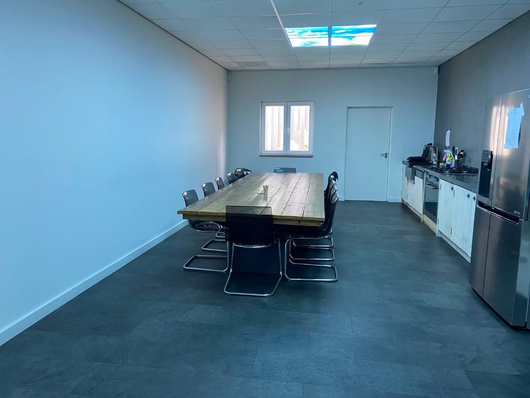 Aan de achterzijde van het gebouw bevindt zich nog een royale berging (ca. 28m2) met rolpoort, de zeer ruime kantine (ca. 41m2) met keukenblok en toegang tot een berging (ca. 5m2) en de moderne toiletruimtes.