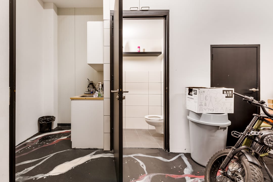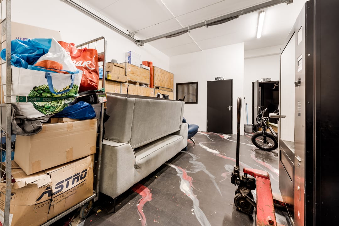 - Overheaddeuren, betonvloer, toilet, pantry, inbouwarmaturen en te openen ramen