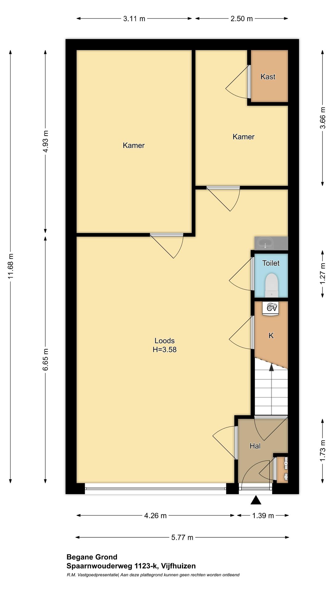 De begane grond beschikt over een opslagruimte, toilet, twee kamers en een handbediende overheaddeur.