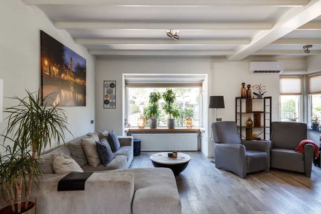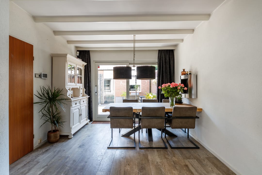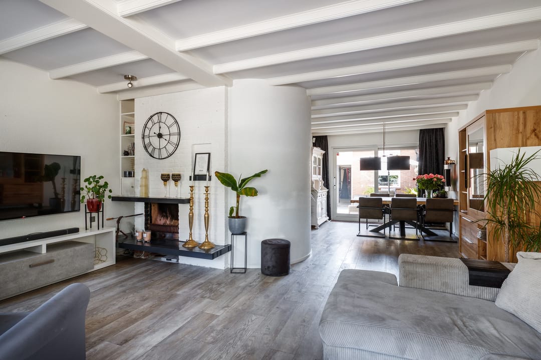 De woonkamer is verdeeld met een zithoek aan de voorzijde en het eetgedeelte aan de achterzijde. Authentieke elementen zoals het balkenplafond, de erker, de sfeervolle open haard en natuurlijk de vloerverwarming zorgen voor warmte en karakter.