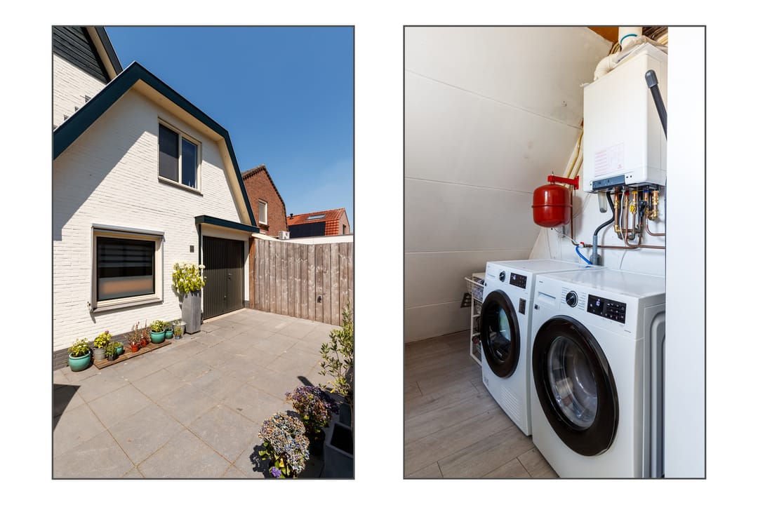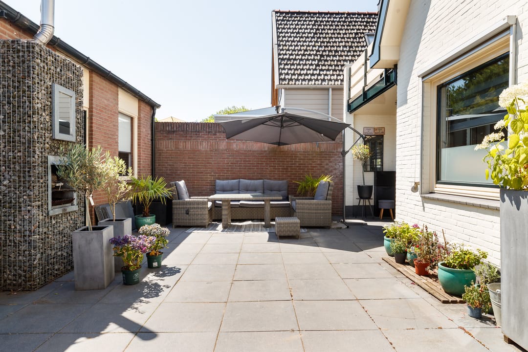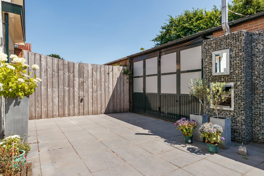 De achtertuin ligt tussen de woning en het royale bijgebouw in en is een fijne plek voor lange zomerse avonden bij de buitenhaard – ook als het wat frisser wordt. Via de garage, met elektrisch deur, is het terrein bovendien uitstekend bereikbaar.