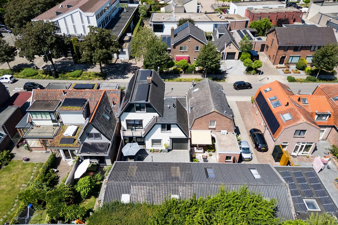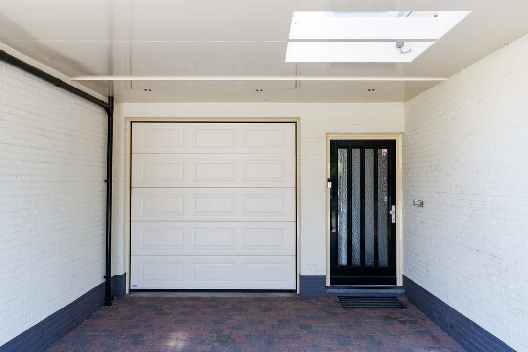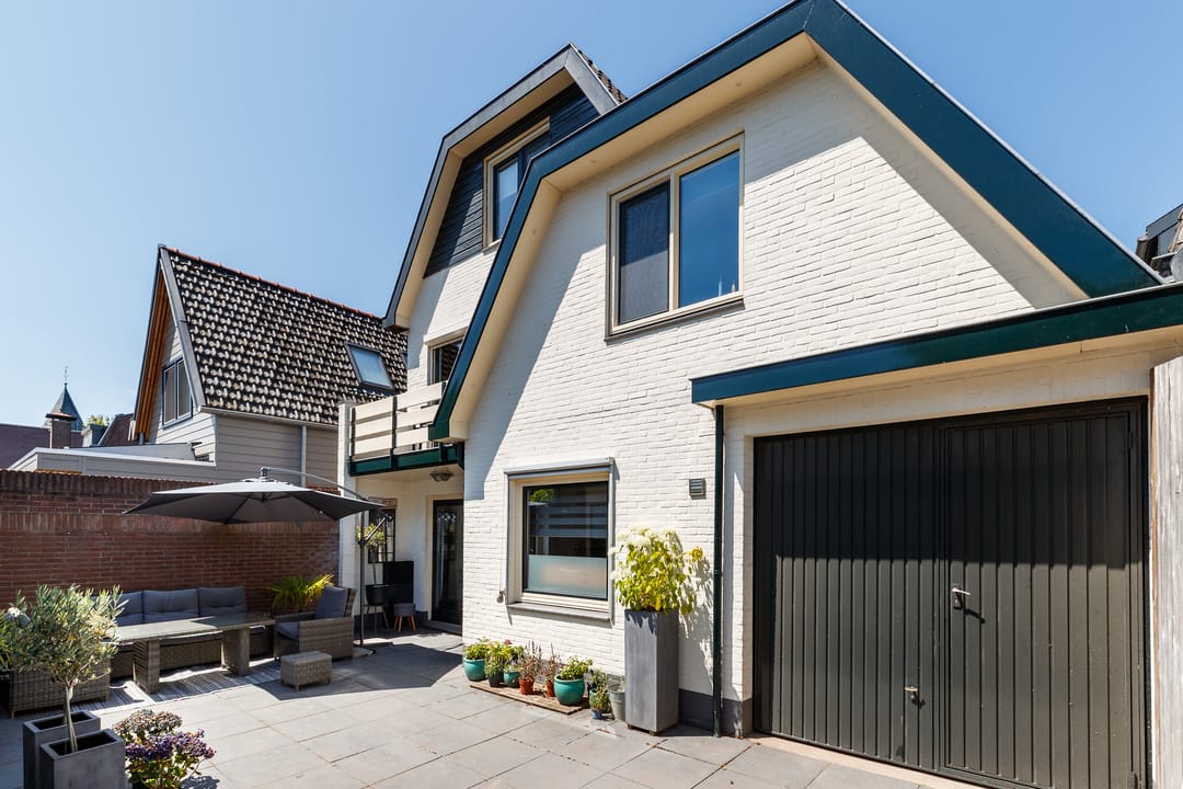 De woning valt direct op in de Schoolstraat: wit geschilderd, statig, en nét even hoger dan de rest. Via een elektrisch hek kom je op het strak aangelegde erf waar je de auto kwijt kunt onder de carport met lichtkoepel of in de garage.