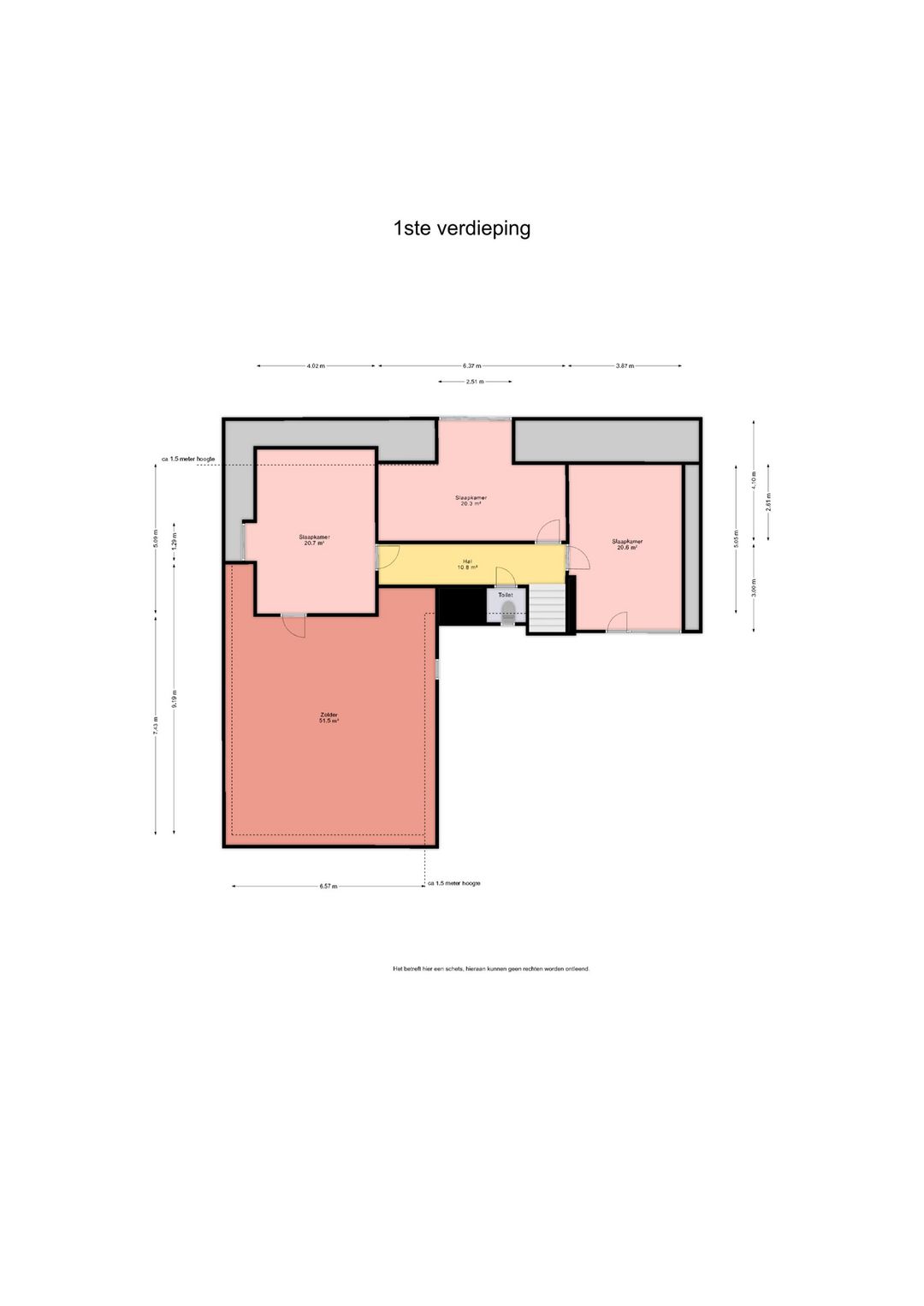Overloop 3 zeer royale (slaap)kamers (resp. ca. 20,6, 20,3 en 20,7m²) 2e toilet, doorgang naar zeer royale bergzolder (ca. 51,5 m²).