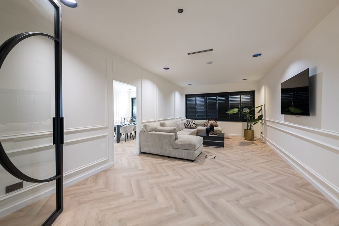 - PVC vloerbedekking in visgraatmotief;