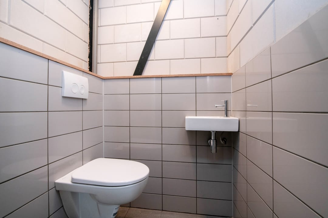 • betegelde toiletruimte met hangend closet, fonteintje en ventilatie.