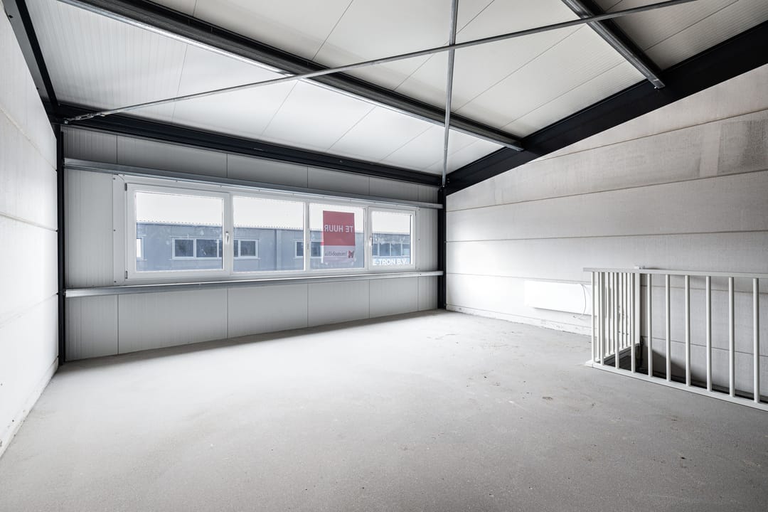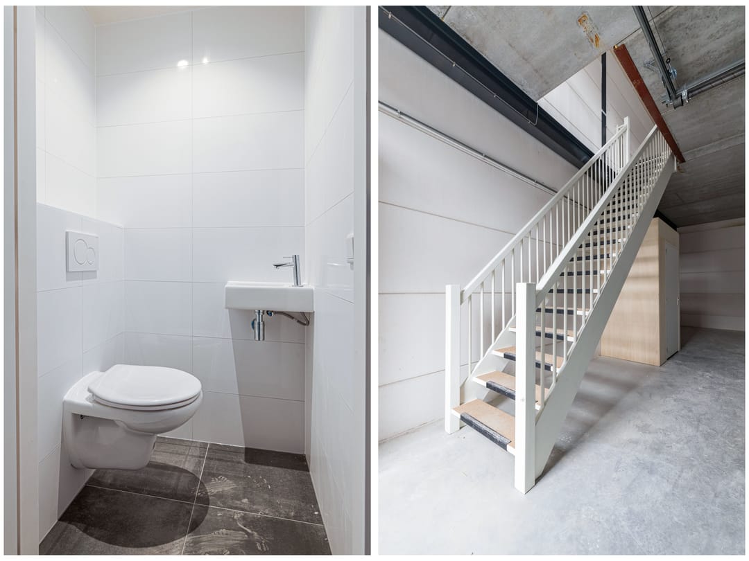 Toegang tot de ruimte via de (loop)deur of de hand bedienbare overheaddeur. De verdieping meet in totaal ca. 61m2. heeft een hoogte van 3,60 meter en uitgevoerd met een keurig toilet. Het toilet is in zijn geheel betegeld met een witte wandtegel, een antracietkleurige vloertegel en is uitgevoerd met een hangend toilet, fonteintje en inbouwspots.