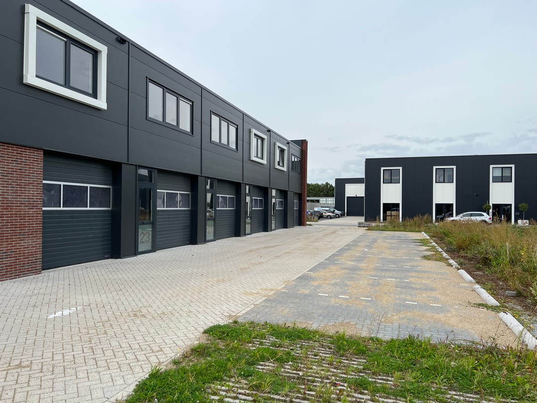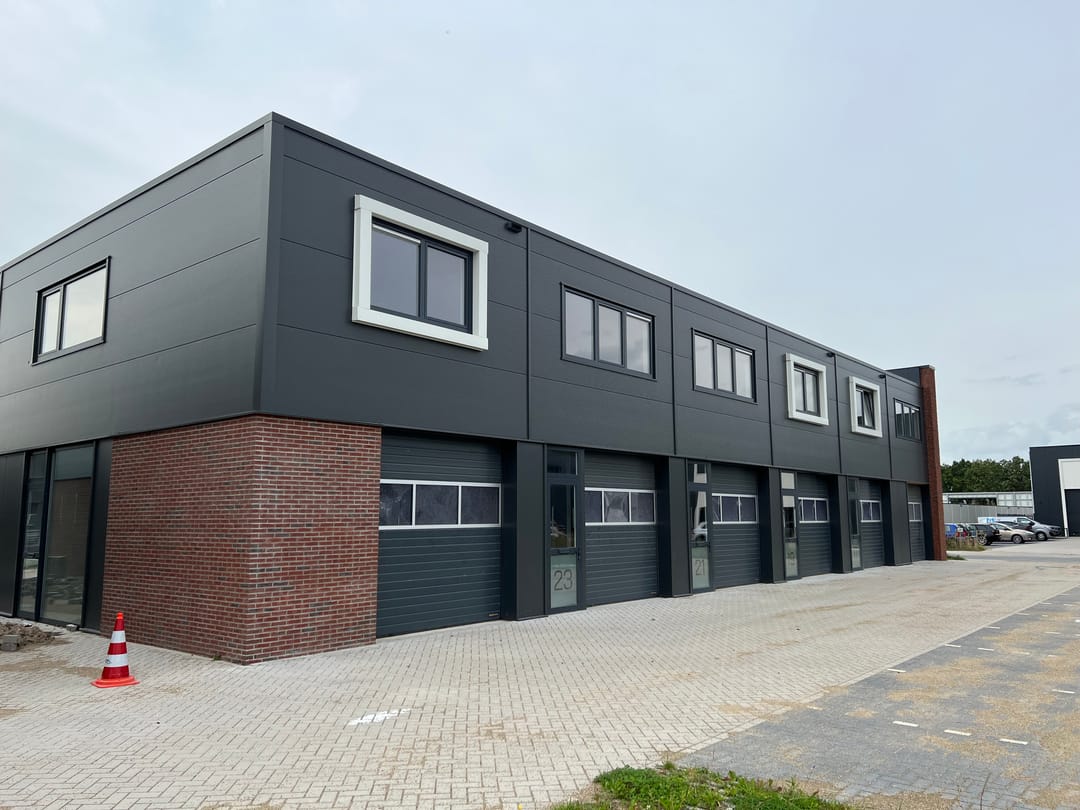 Solide hoogwaardig gebouwde stijlvolle bedrijfsgebouwen met doordachte architectuur. Denk hierbij aan Accoya (of gelijkwaardig, dan wel product met gelijksoortige uitstraling) duurzame houten gevelverfraaiing (), metselwerk, premium Hörmann overhead deuren () en volledig betonnen/kalkzandsteen casco.