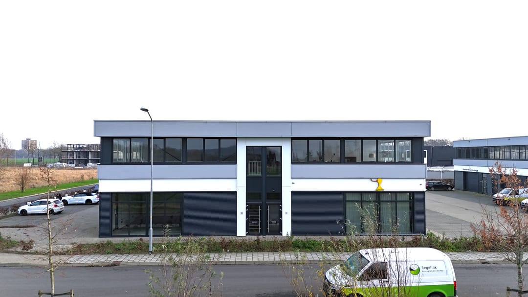 Prachtige hoekunit met grote raampartijen en grote overheaddeur gelegen op bedrijventerrein Nudepark II te Wageningen.