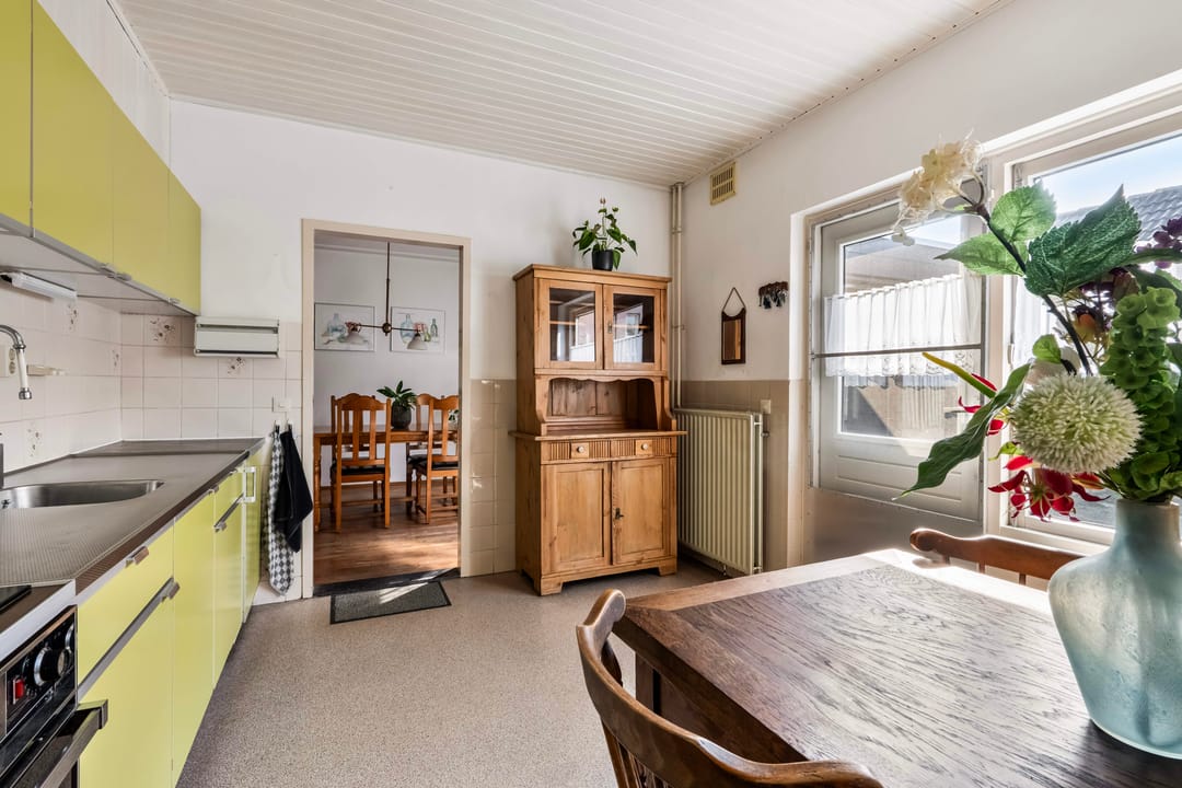 De keuken ligt aan de achterzijde en kijkt uit over de tuin. Deze praktische ruimte biedt voldoende opbergruimte en werkblad en is voorzien van ingebouwde apparatuur, waaronder een inductiekookplaat en oven