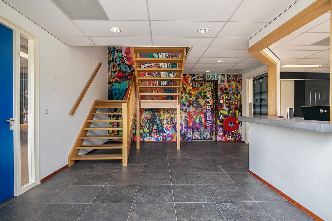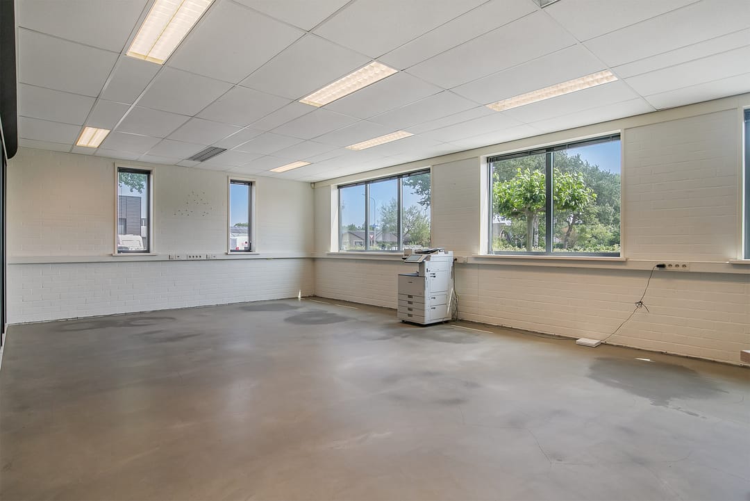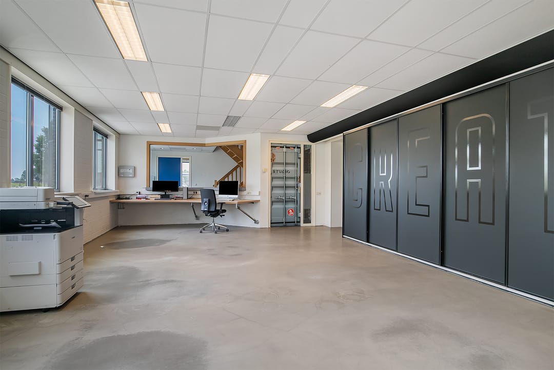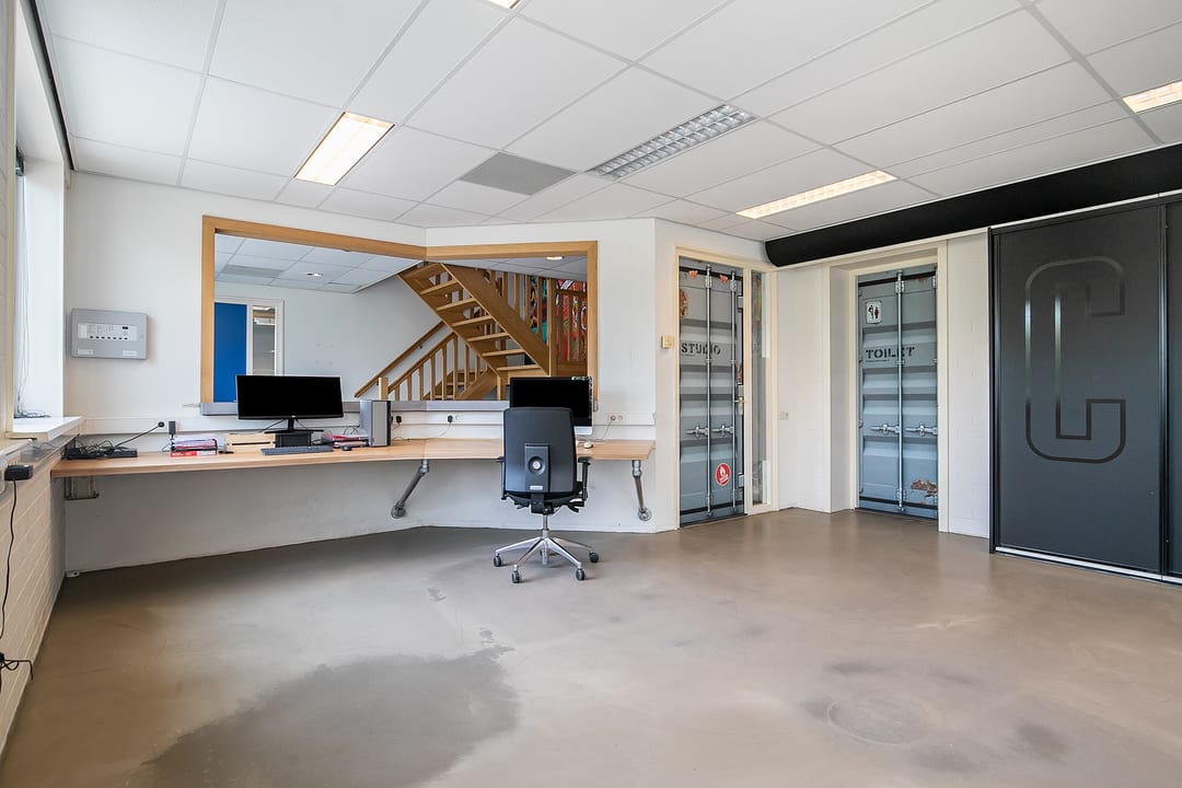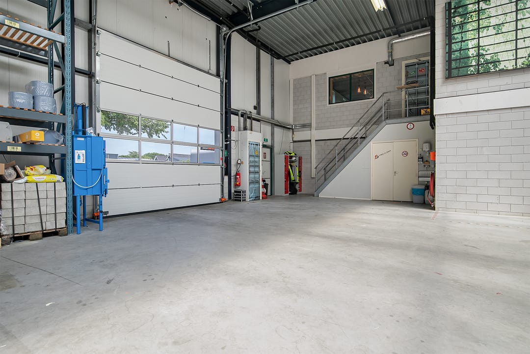 Begane grond: Royale en hoogwaardig afgewerkte hal met trap naar 1e verdieping. Voorportaal, 2 kantoorruimten en de toegang tot de achtergelegen bedrijfsruimte. De bedrijfsruimte is tevens van buitenaf toegankelijk middels een loopdeur en een royale elektrisch bedienbare overheaddeur. De bedrijfsruimte beschikt over een eigen toiletruimte. Tevens is er nog een extra nooduitgang aanwezig.