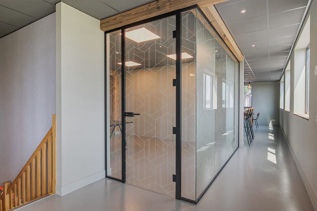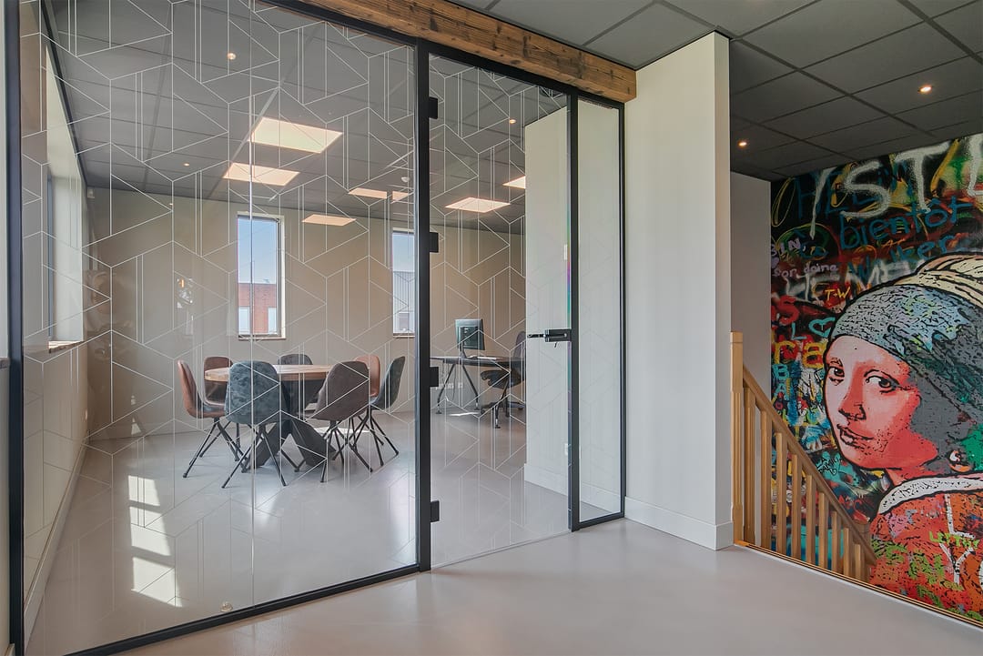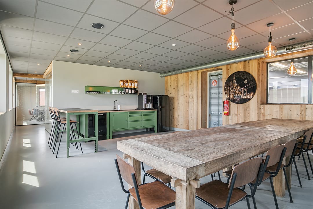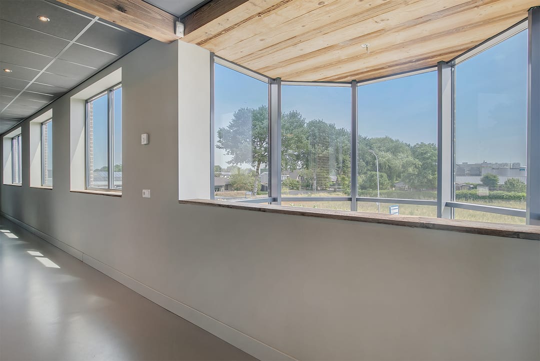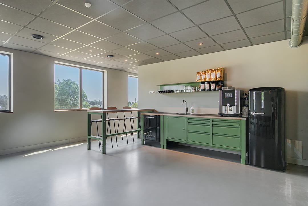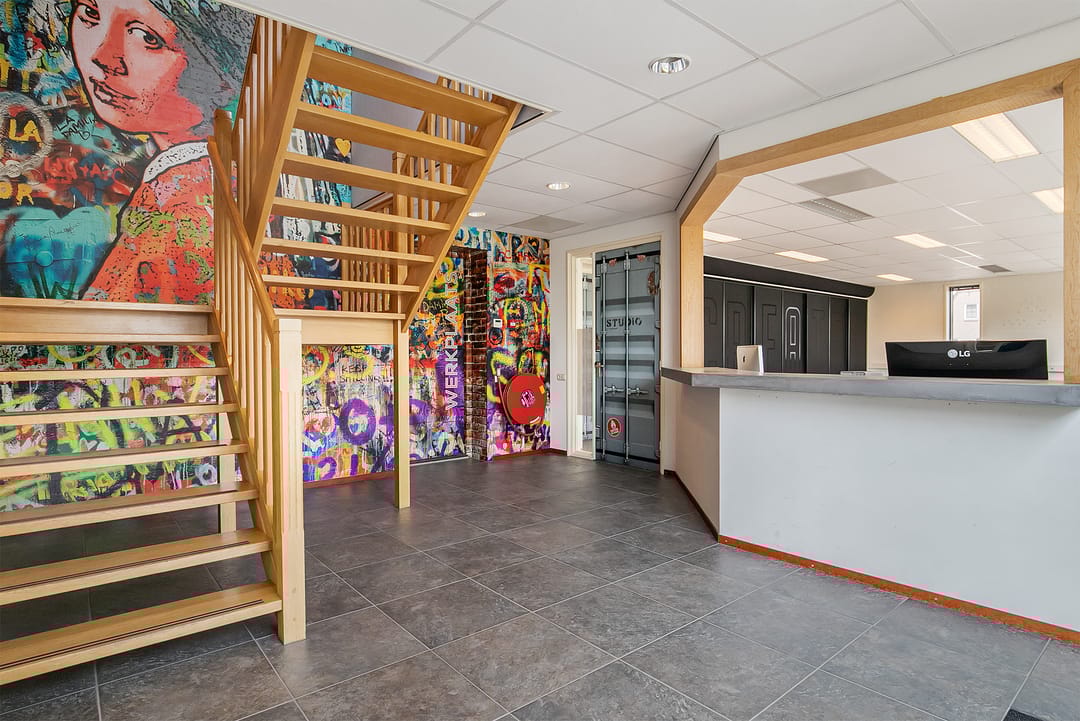 1e verdieping: Royale overloop met vide en toegang tot de kantine (met keuken) en kantoor- en archiefruimte. Vanuit de kantine is tevens een stalen trap naar de bedrijfsruimte aanwezig.