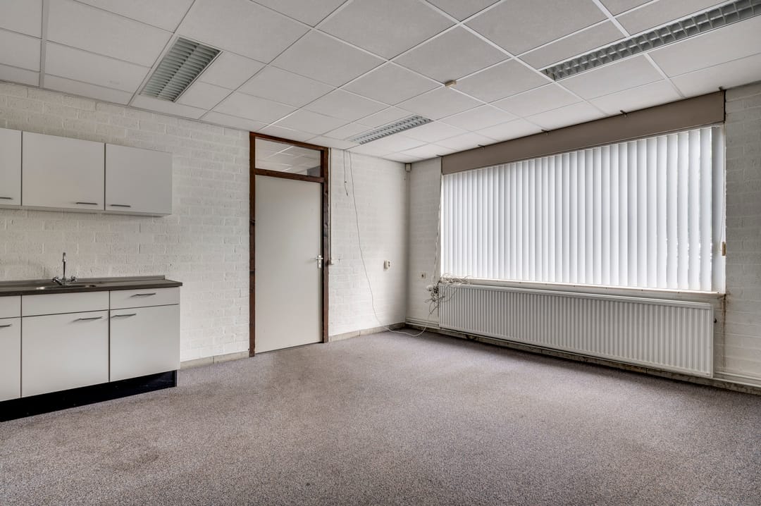 De eerste ruimte is voorzien van een keukenblok, vloerbedekking, systeemplafond, TL-armaturen, radiator en ramen aan de voorzijde. Deze ruimte is ca. 21,32 m² groot.