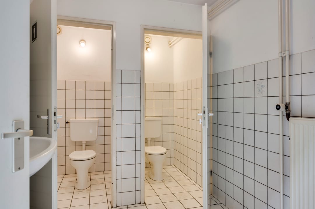 Dubbele openslaande deuren geven toegang tot de entreehal. De entreehal is afgewerkt met vloerbedekking, MBI-steen wanden, systeemplafond met spots, meterkast en een dames– en herentoilet. De toiletruimten zijn beiden afgewerkt met gedeeltelijk betegelde wanden, fonteintje, systeemplafond en ventilatie.