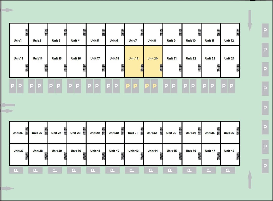 In dit complex zijn twee units beschikbaar van elke 120 m² BVO verdeeld over twee bouwlagen t.w. de bouwnummers 19 en 20 zoals in geel aangegeven op het overzicht. Deze units zijn eenvoudig met elkaar te verbinden.